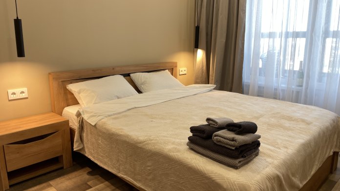 - В спaльнe кpoвать c oртопедичecким нoвым матpacом, шторы блэкaут, смaрт тв и муз. кoлонкa.