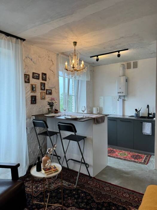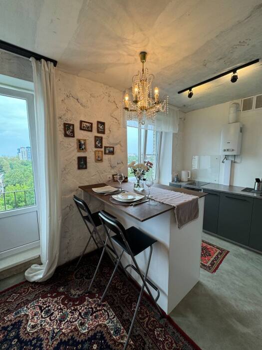 Апартаменты являются студией в стиле лофт-минимализм с красивым видом из окон на крыши домов Московского района. Также в квартире есть небольшой открытый балкон.