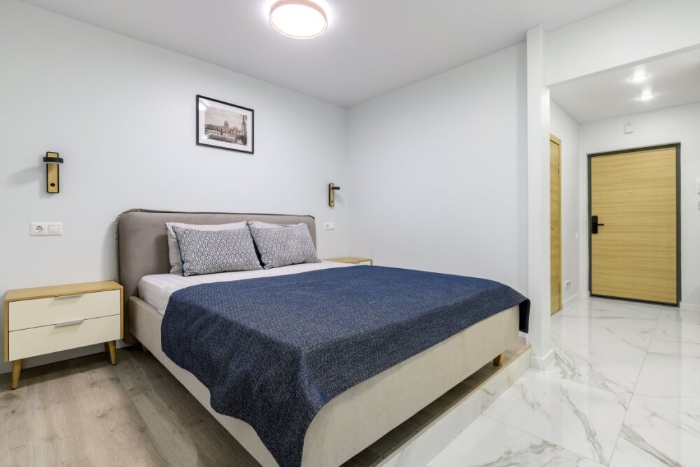 Уютная студия расположена в Красногвардейском районе Санкт-Петербурга. Поблизости находится красивая набережная и знаменитый Большеохтинский мост, на противоположном берегу открывается великолепный вид на Смольный собор. В пешей доступности Никольская церковь и Георгиевский сквер. В 2 км находится парк имени 50-летия Октября. Район тихий: рядом большое количество школ и детский садов, поликлиника, несколько торговых центров, крупнейший и ближайший из них «Охта Молл». До центра города вы можете добраться за 15 минут на автомобиле. До станции метро «Ладожская», «Новочеркасская», а также Ладожского вокзала ходят автобусы, время в пути- 20-25 минут. До аэропорта час езды. Автобусные и трамвайные остановки прямо рядом с домом. Вы также можете воспользоваться бесплатной парковкой рядом с апартаментами.