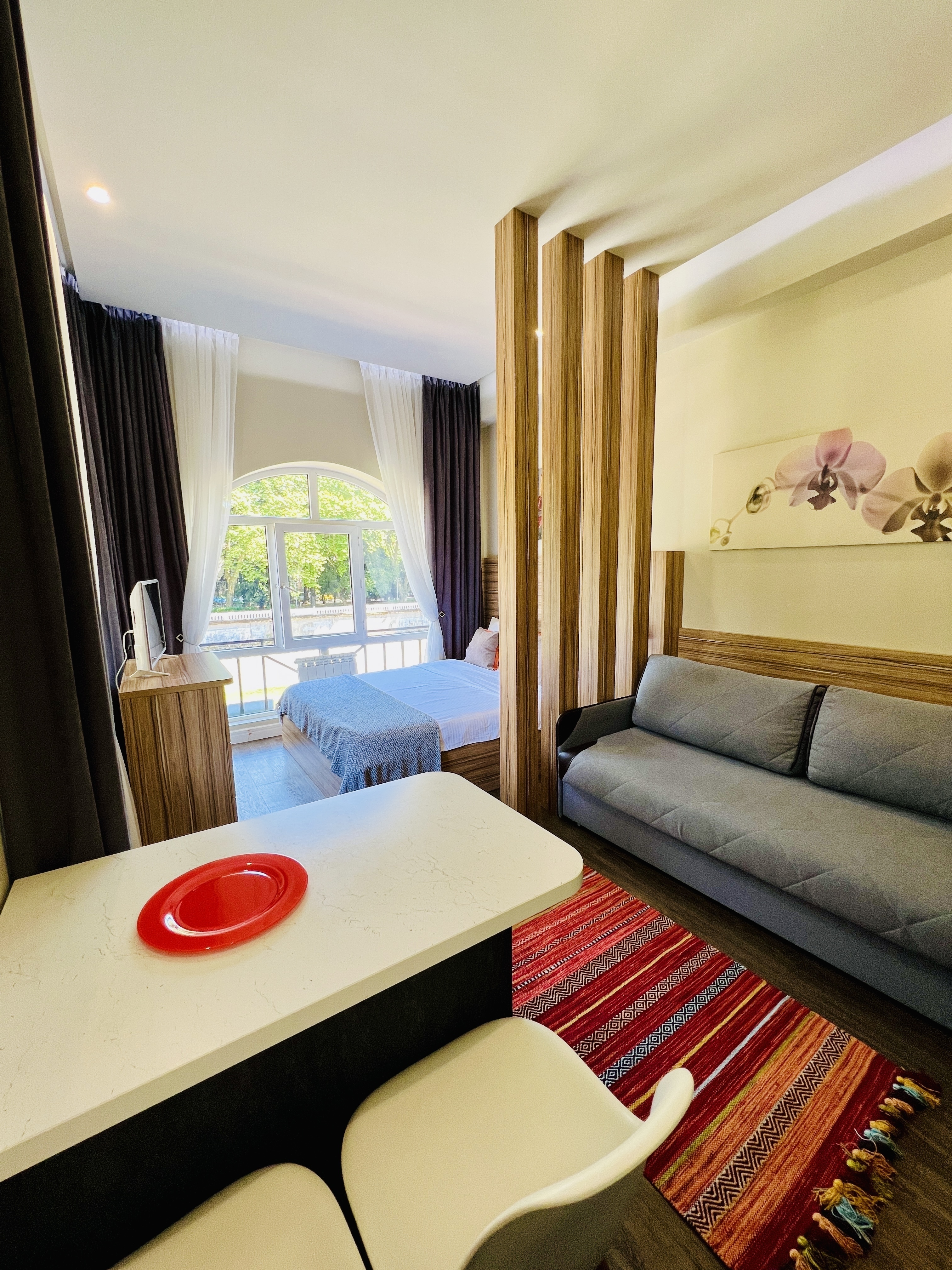Апартамент расположен на набережной реки Сочи в 450 метрах от пляжа, всего 5 минут и Вы на пляже. Основным критерием выбора для отдыха с детьми - это близость к парку Ривьера, с его разнообразными аттракционами, обновленным картингом, уютными кафешками и великолепным розарием. Организовать привычное питание для ребенка легко, есть кухня и все приспособления.