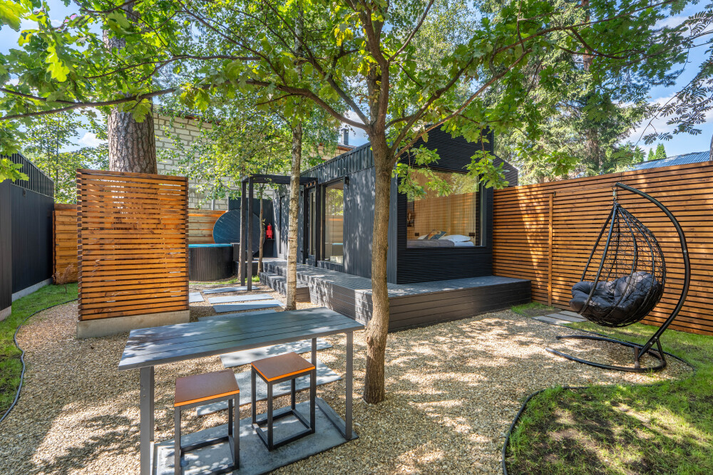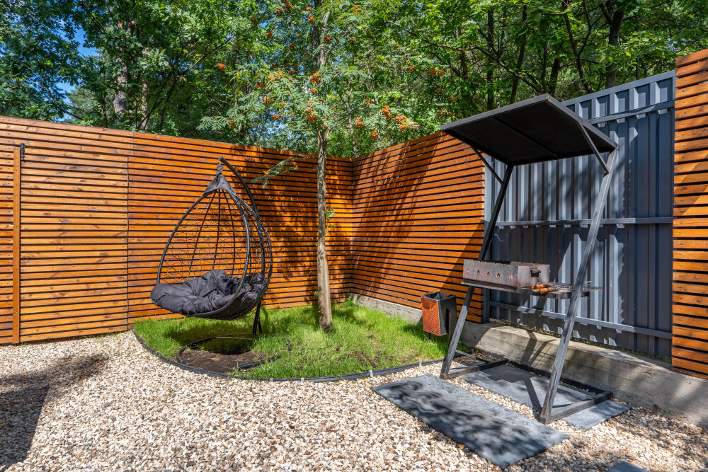- Мангальная зона; подвесные кресла — коконы!