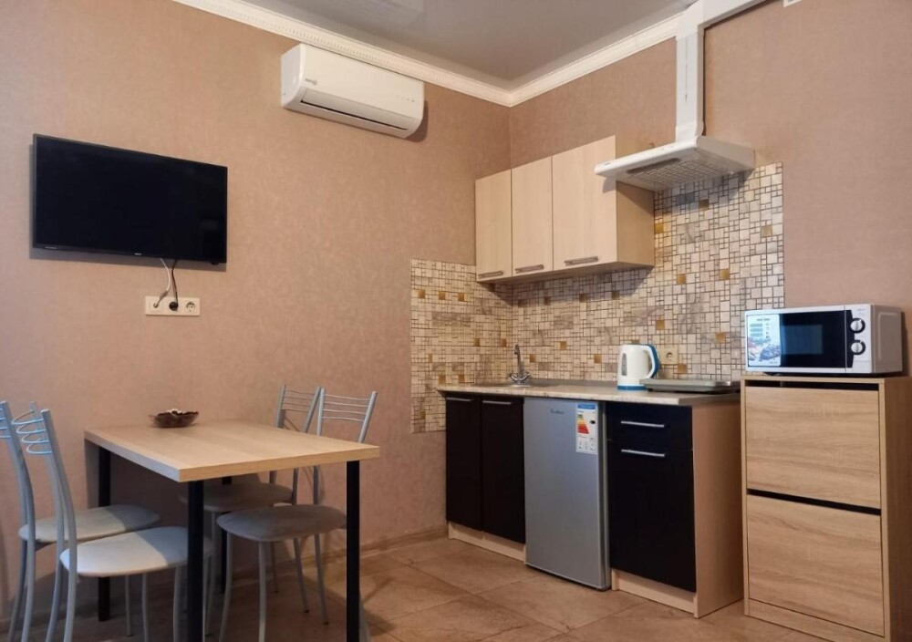 Имеется терраса, телевизор, кондиционер, шкаф, вешалка, зеркало, журнальный столик, кухня, посуда, чайник, электрическая плита, холодильник, стулья.