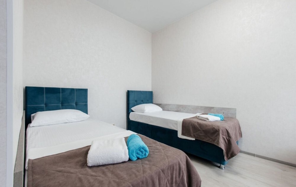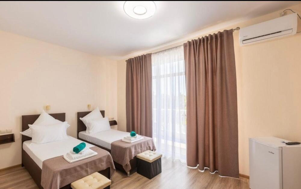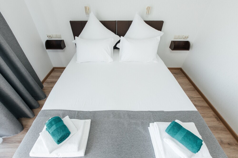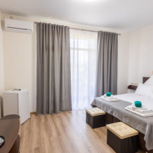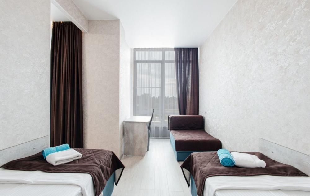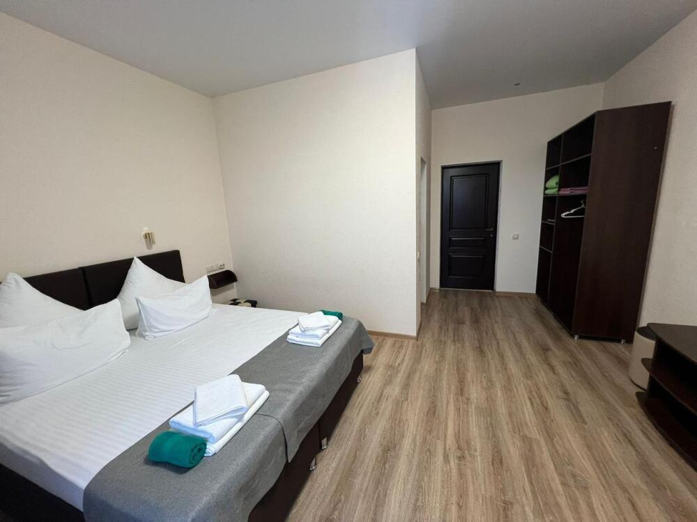 В номере двухспальная кровать, возможно доставить доп. место для размещения 3-го человека. Так же возможно разделить кровати.