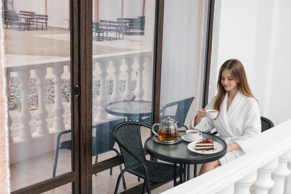 В каждом номере есть свой балкон, на котором можно провести вечер за чашечкой ароматного чая. В стоимость номера входит: