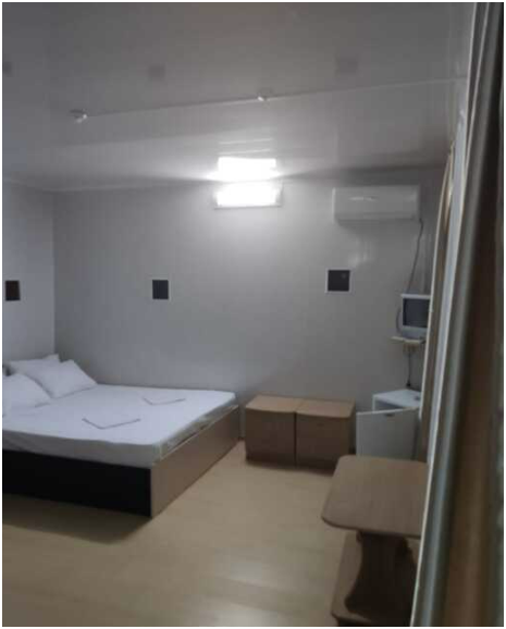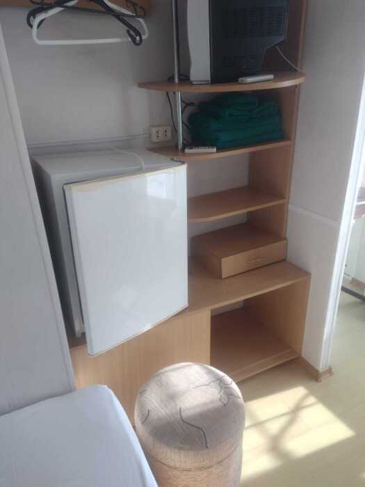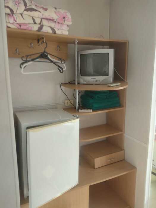 В номере: двухспальная кровать, тумбочка, столик журнальный, полки и ящики для белья, телевизор, кондиционер, душ, туалет в номере, горячая вода (электробойлер).