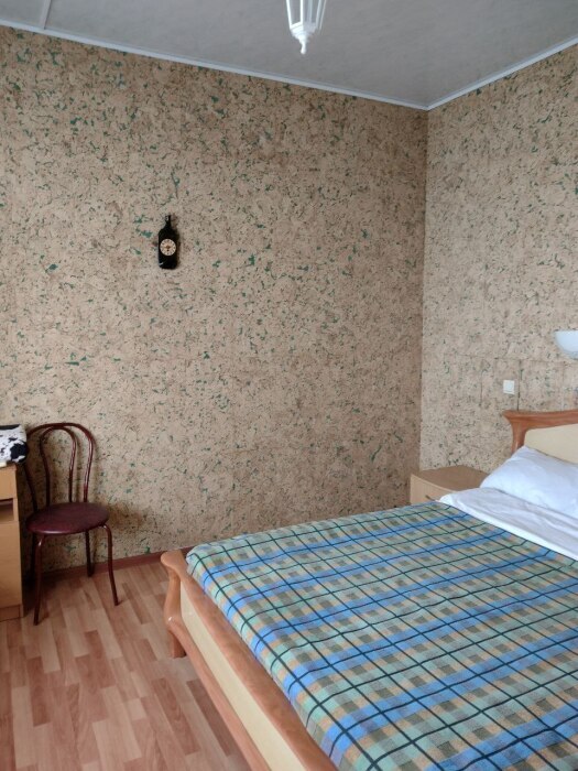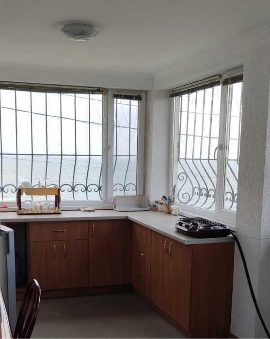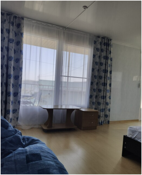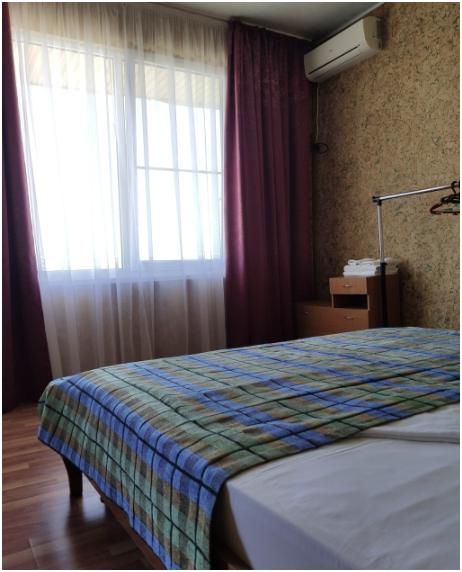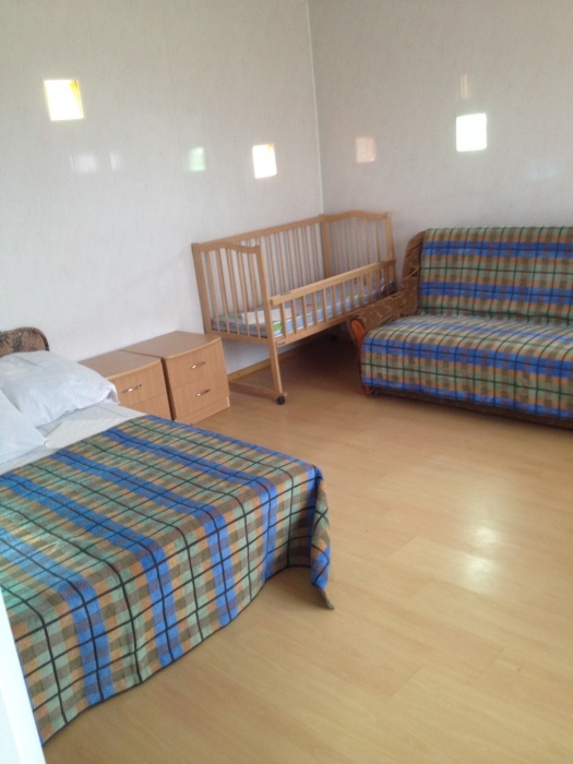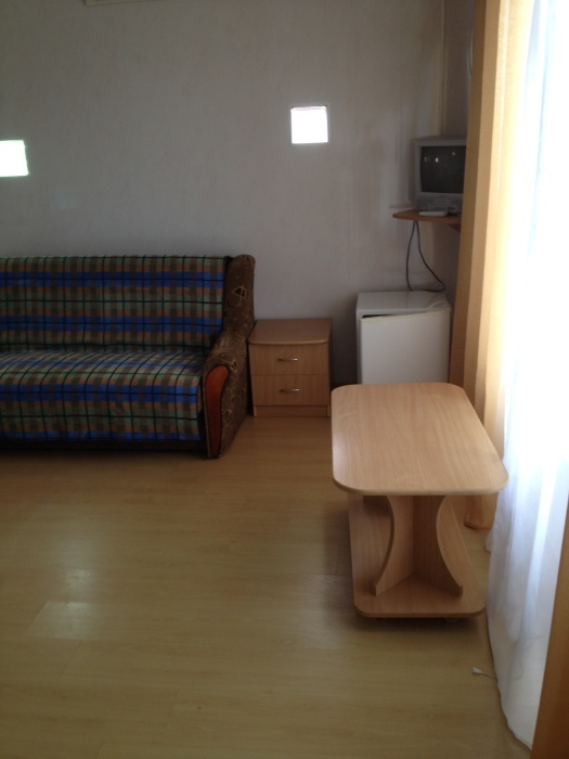 В номере: двухспальная кровать, раскладной диван, тумбочки, столик журнальный, полки и ящики для белья, телевизор, кондиционер, душ, туалет в номере, горячая вода (электробойлер).