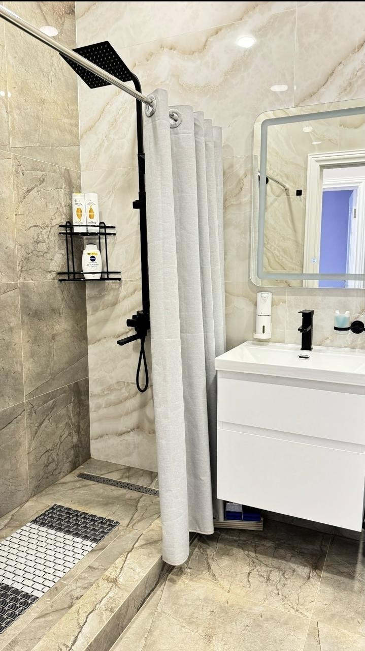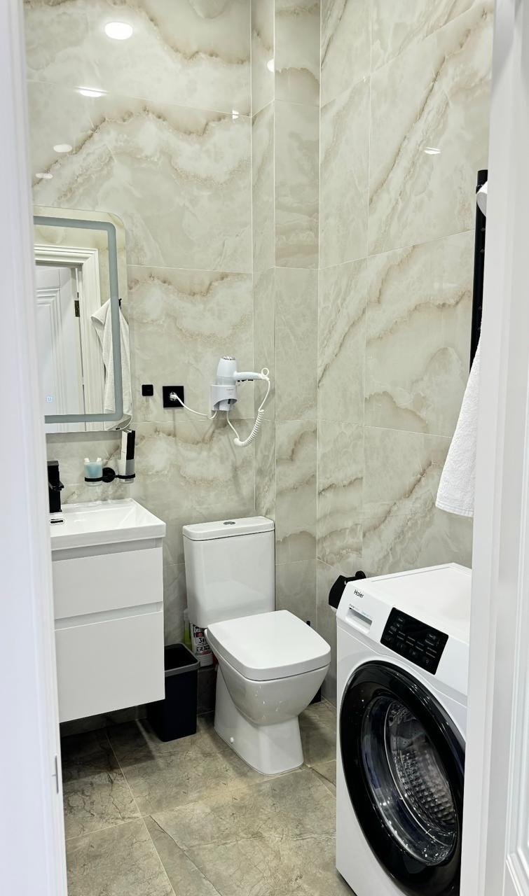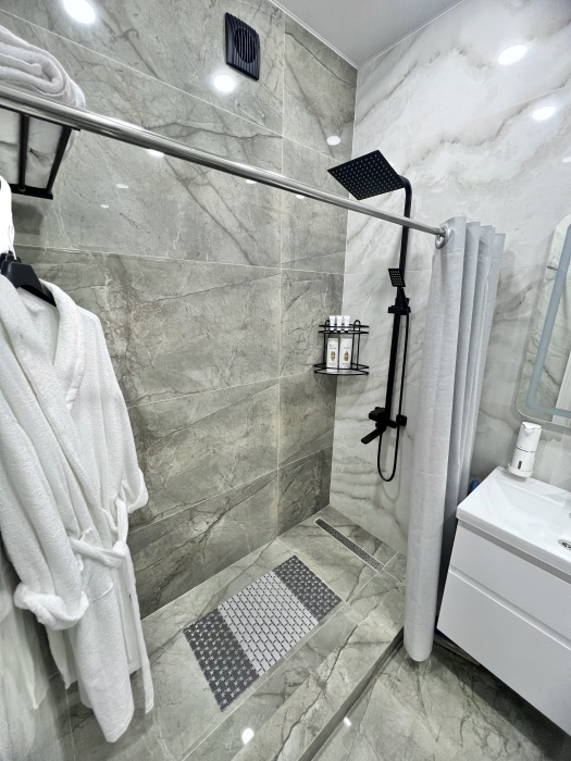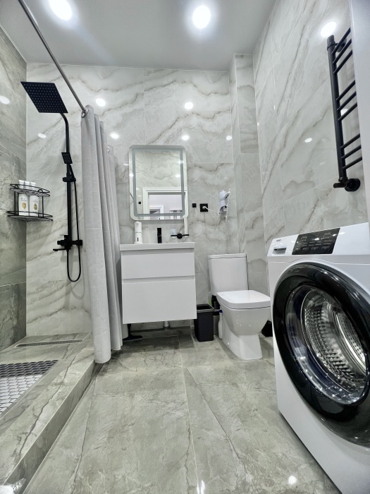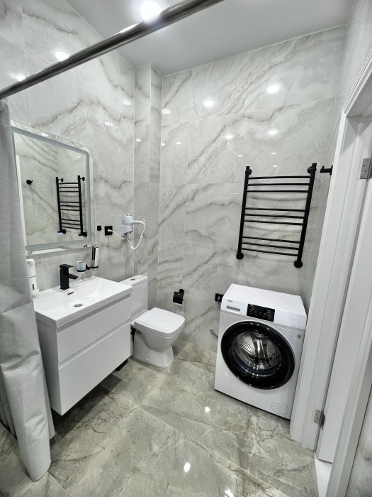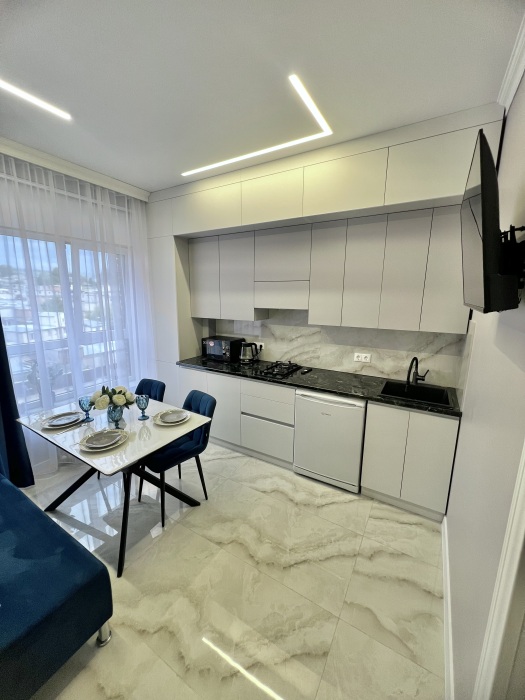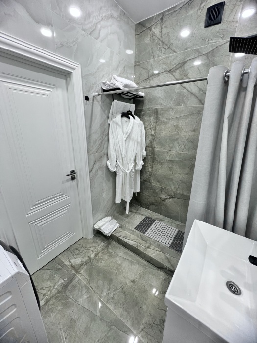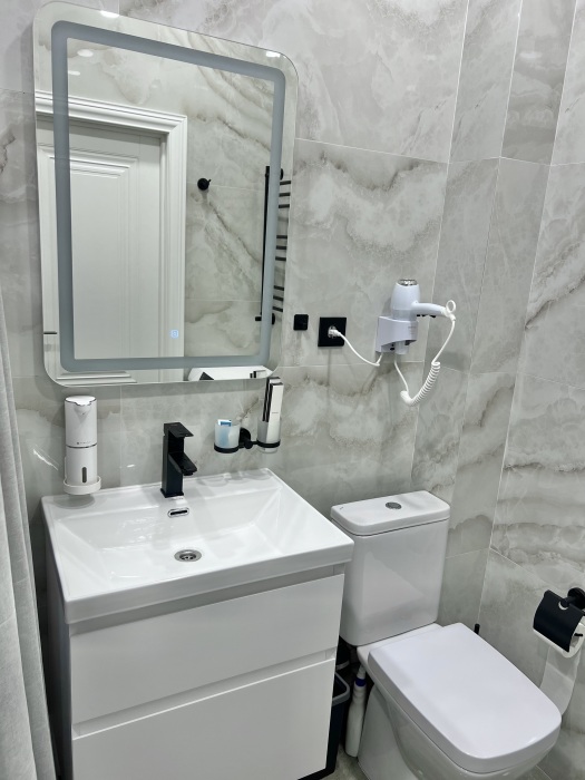 Вся бытовая техника и сантехника новые. Одна двухспальная кровать и раскладной диван, душевая, чистое постельное белье, полотенца, халат, тапочки, микроволновая печь, кондиционер, холодильник, газовая варочная панель. Вся необходимая посуда, электрический чайник, стиральная машина, фен, утюг гладилка.
