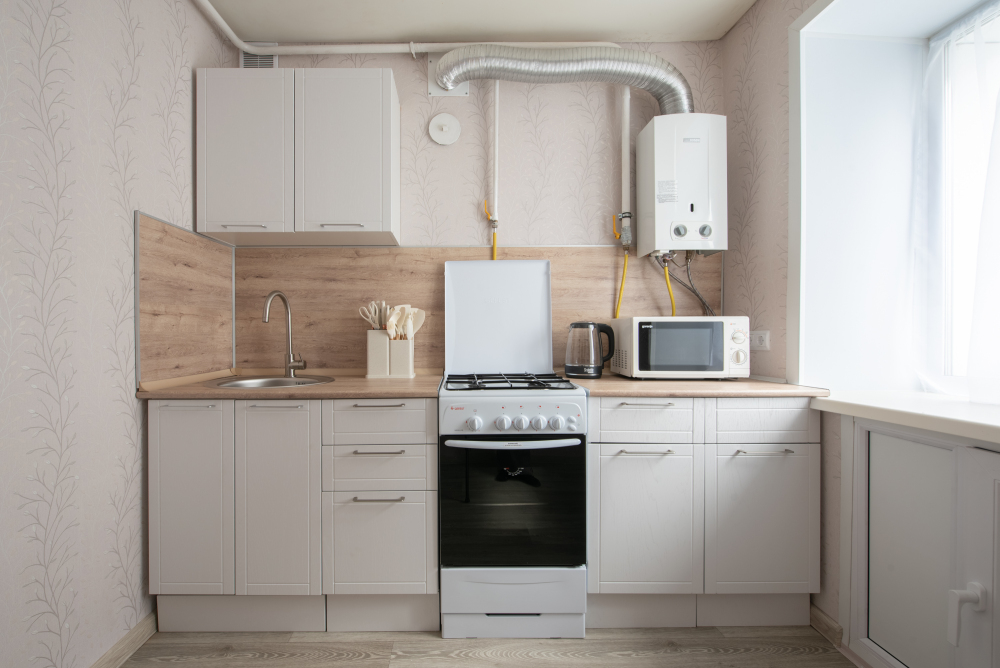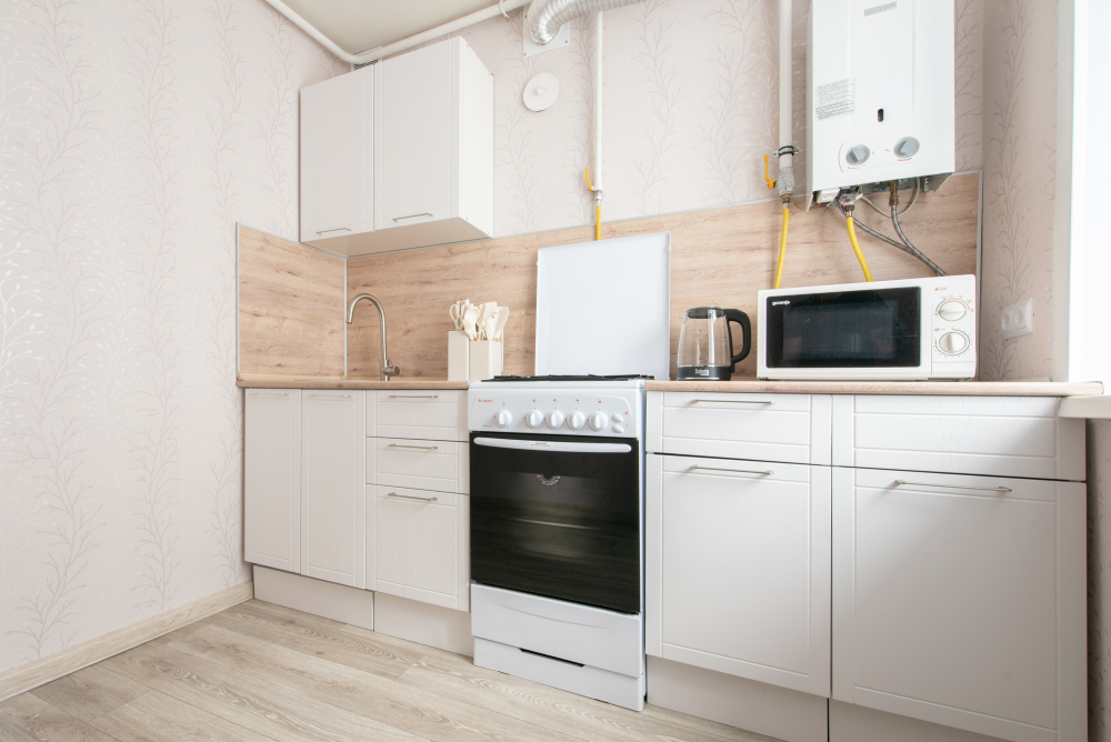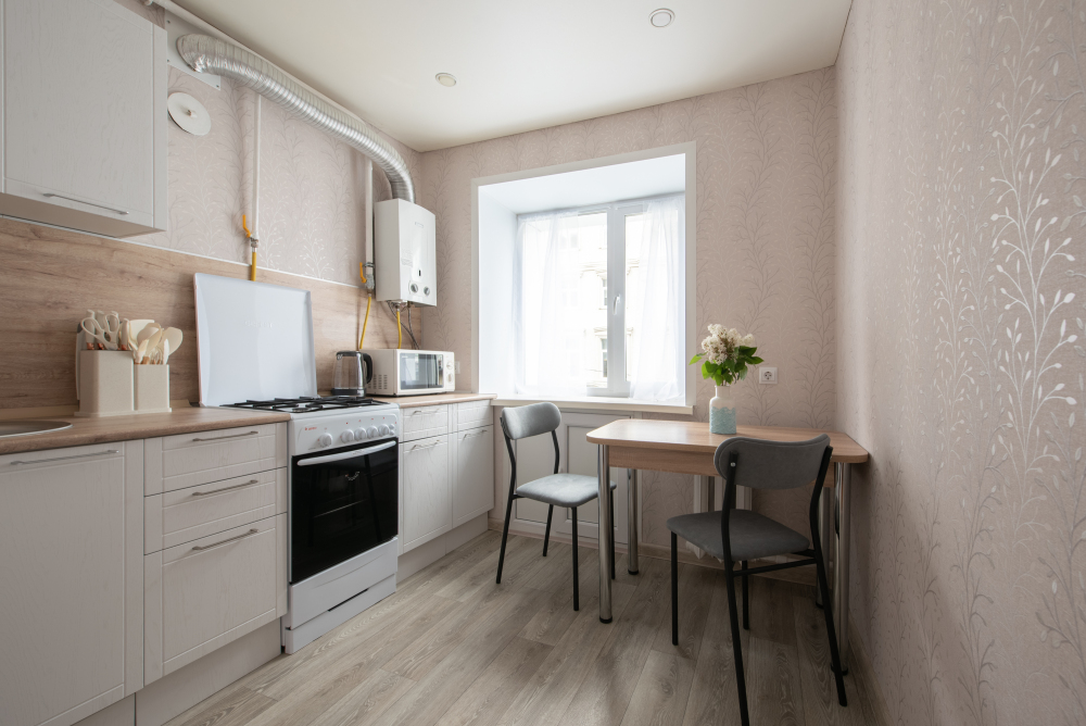 - Полностью оборудованную кухню: чайник, плита, духовой шкаф, холодильник, микроволновая печь и всё необходимое для готовки.