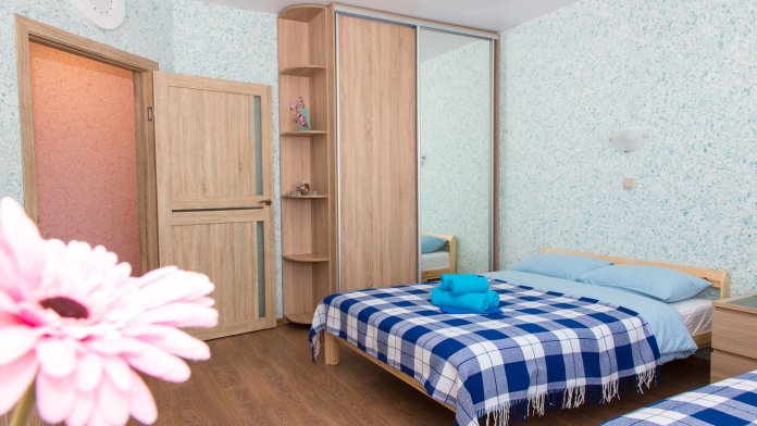 Вмещает до 4-х гостей, двуспальная кровать + односпальная кровать + хорошая раскладушка.