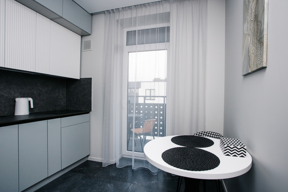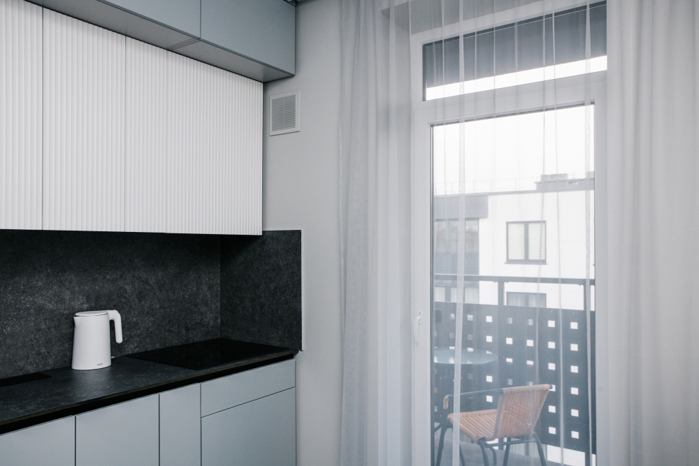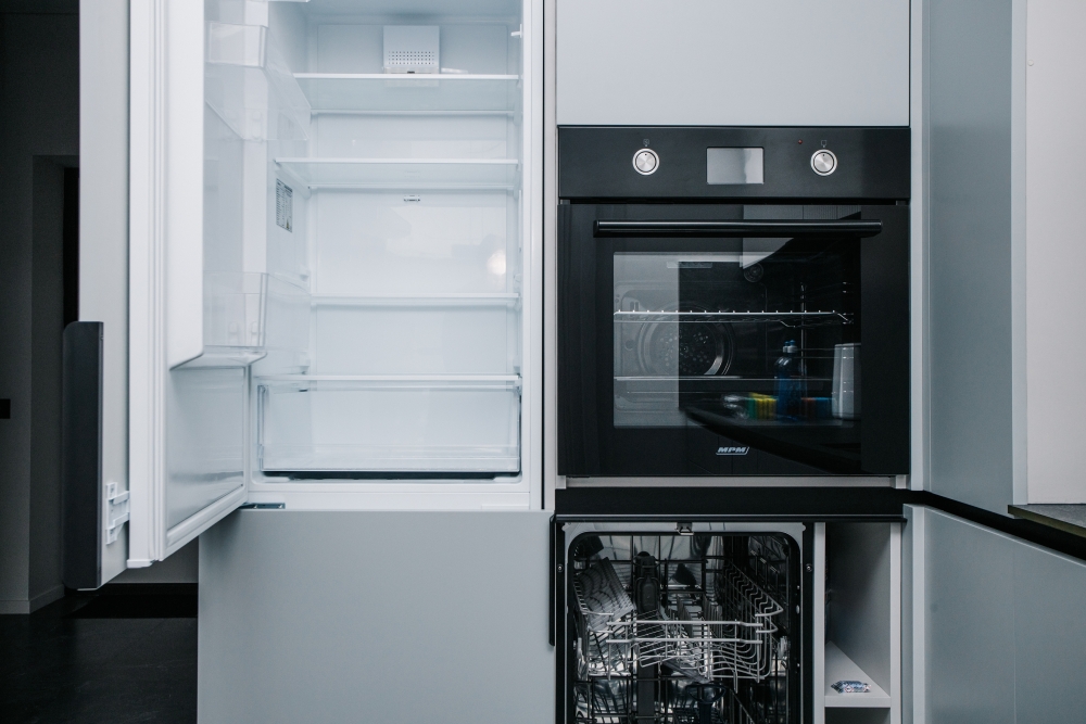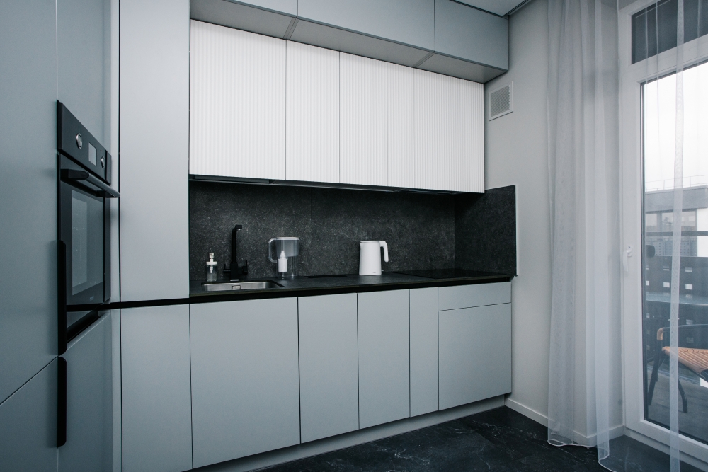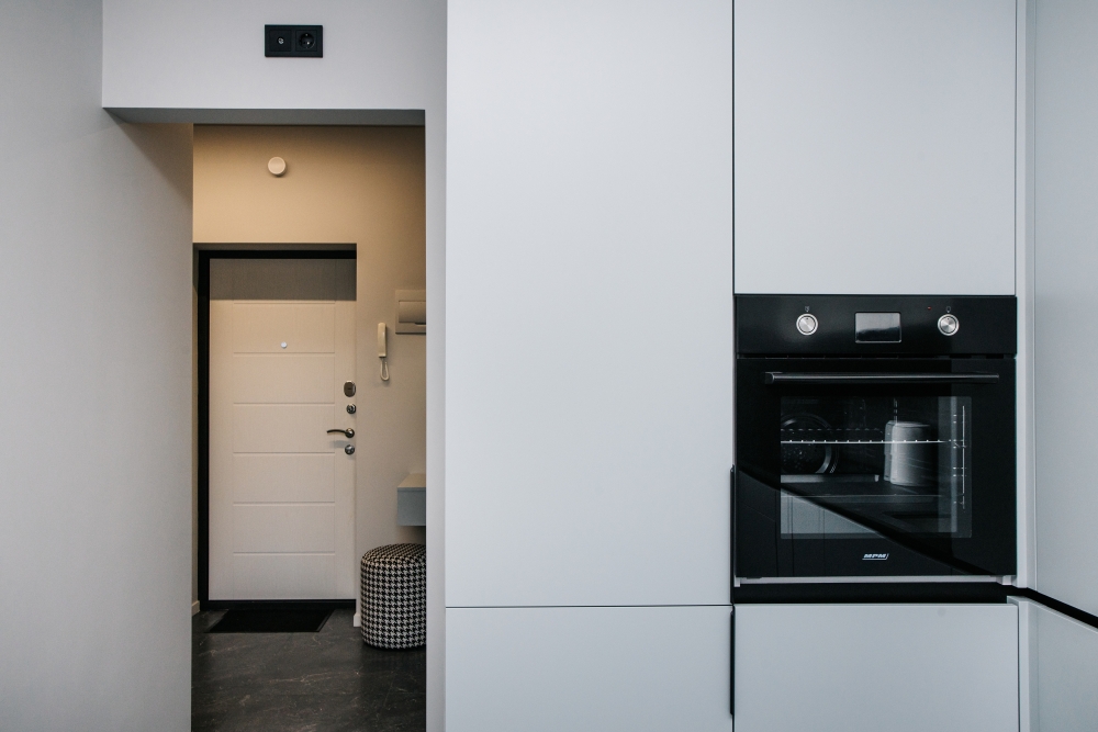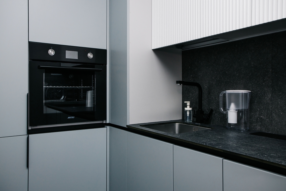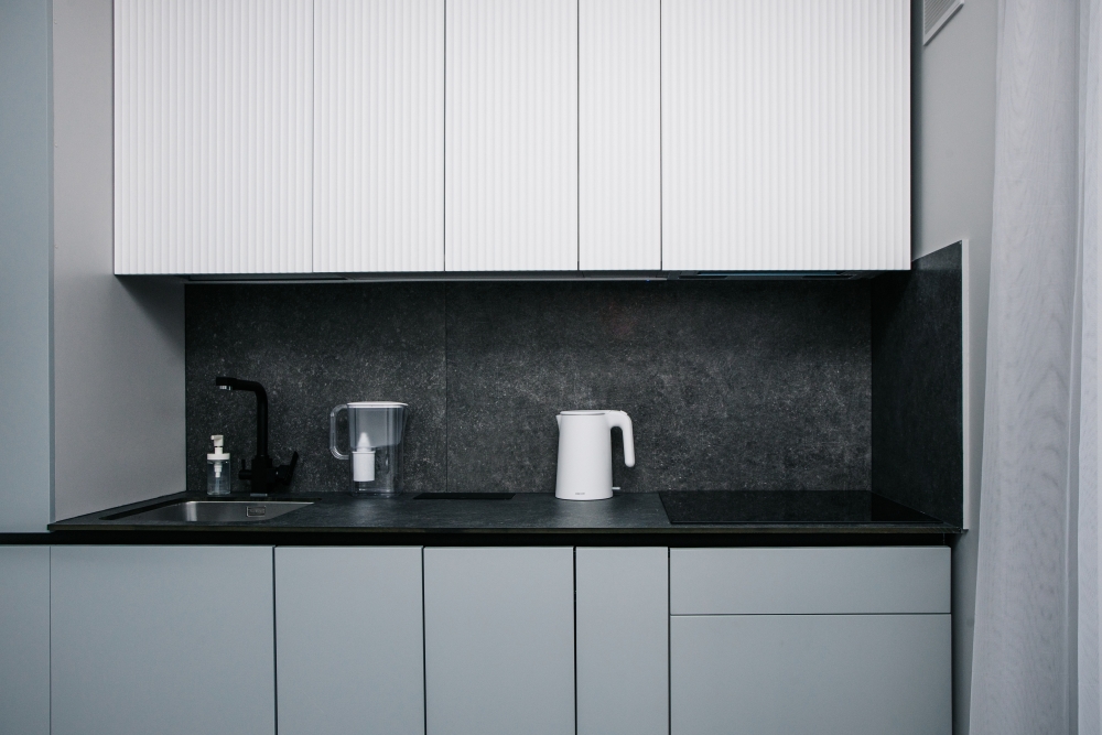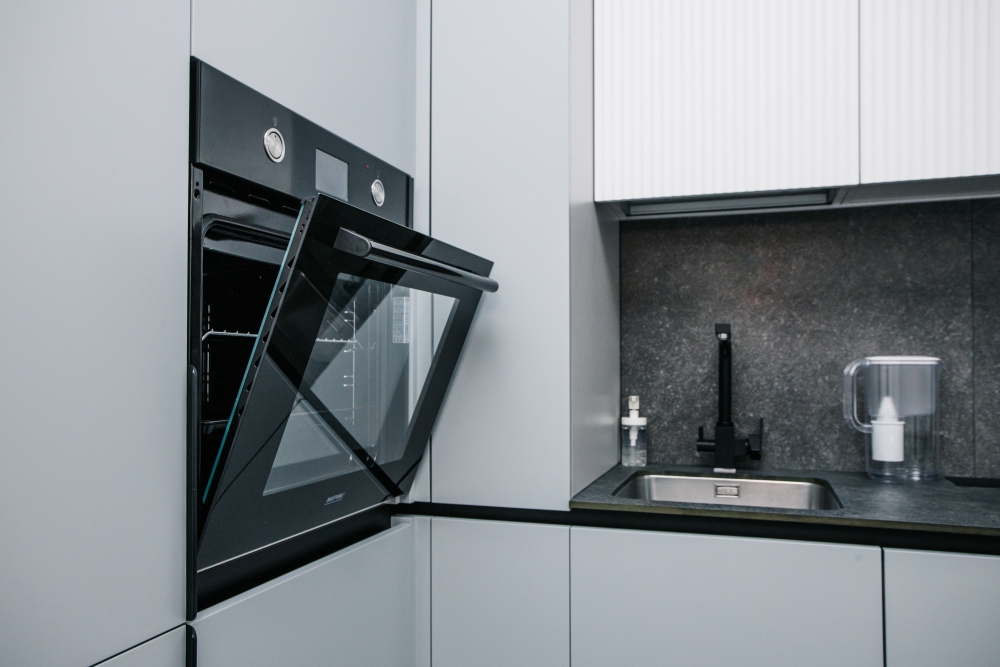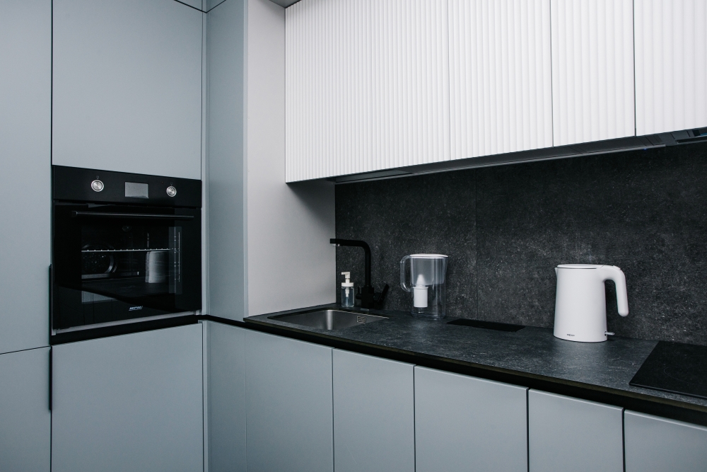 Кухня оснащена: холодильником, плитой, кофеваркой, посудомоечной машиной, фильтром для воды, электрическим чайником, микроволновой печью.
