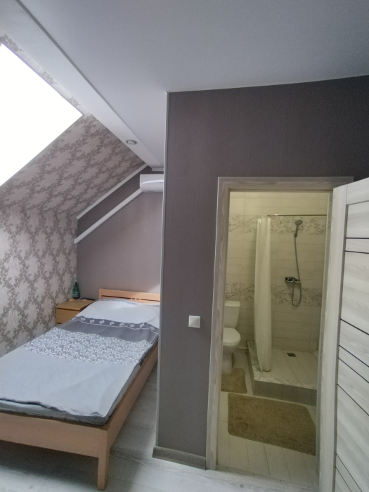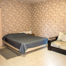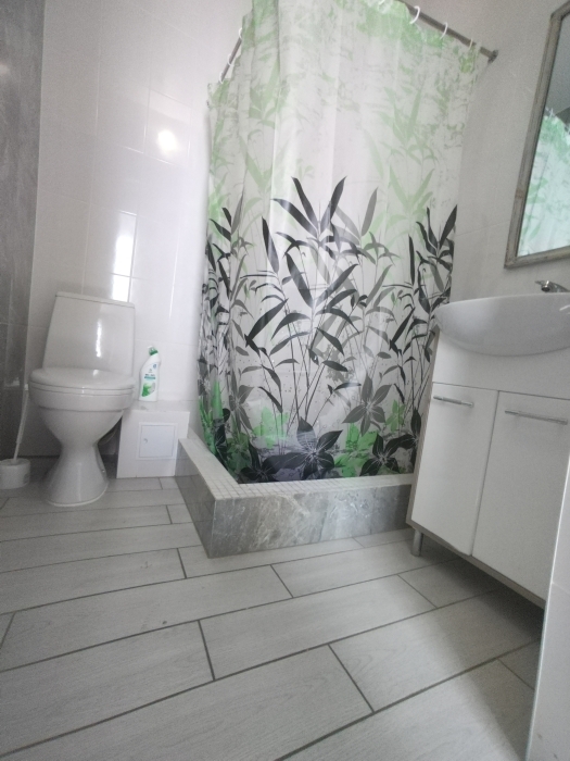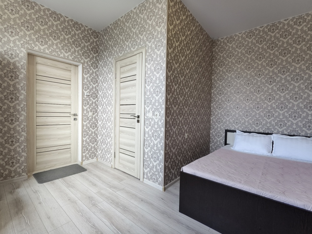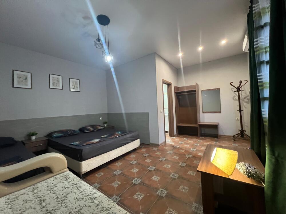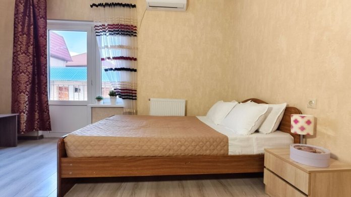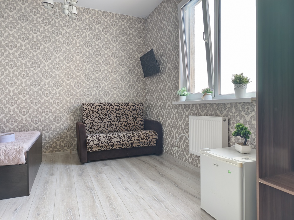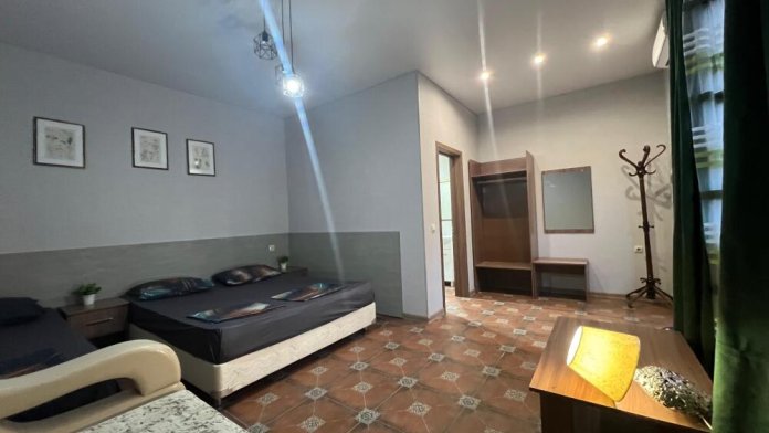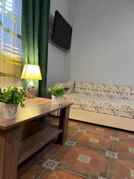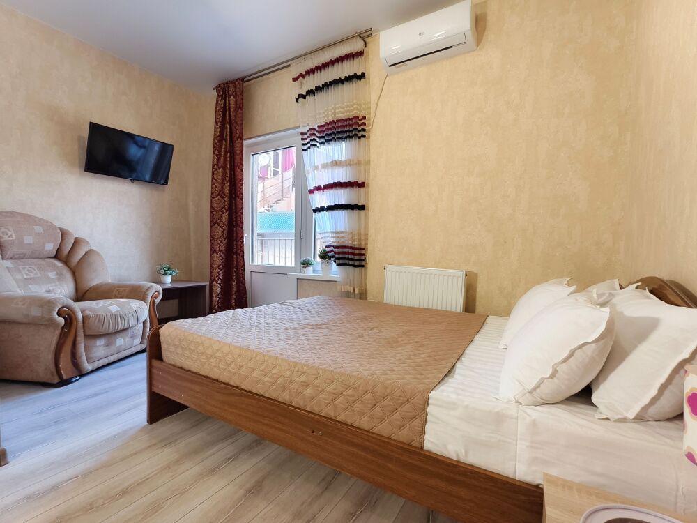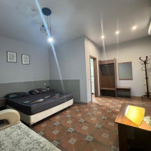 1-комнатный номер с отдельным входом, на первом этаже. Номер оснащен: двуспальная кровать и диван-кровать, прикроватная тумбочка, журнальный столик, стулья, шкаф, ТВ, кондиционер, холодильник. Ванная комната: раковина, зеркало, душ, унитаз.