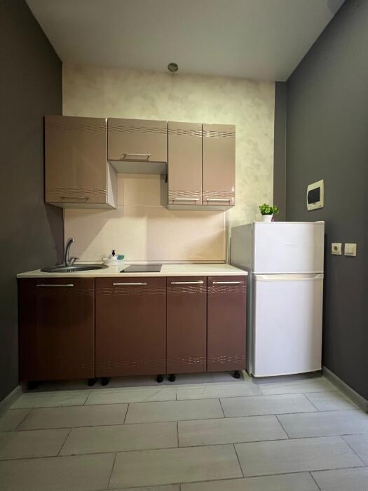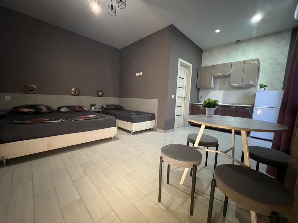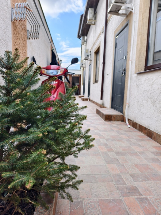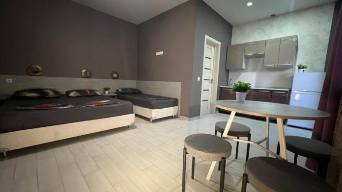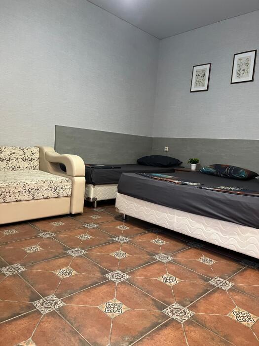 1-комнатный номер с кухней и зоной отдыха возле номера. Номер с отдельным входом, на 1 этаже (вид на стену). В номере имеется: двуспальная кровать и односпальная кровать, диван-кровать, прикроватная тумбочка, журнальный столик, шкаф, стол, стулья, ТВ, кондиционер. В номера собственная кухня: электроплита, чайник, холодильник, мойка, посуда. Ванная комната: раковина, зеркало, душ, унитаз. Перед номеров: стол и стулья для отдыха. Сушилка для белья.