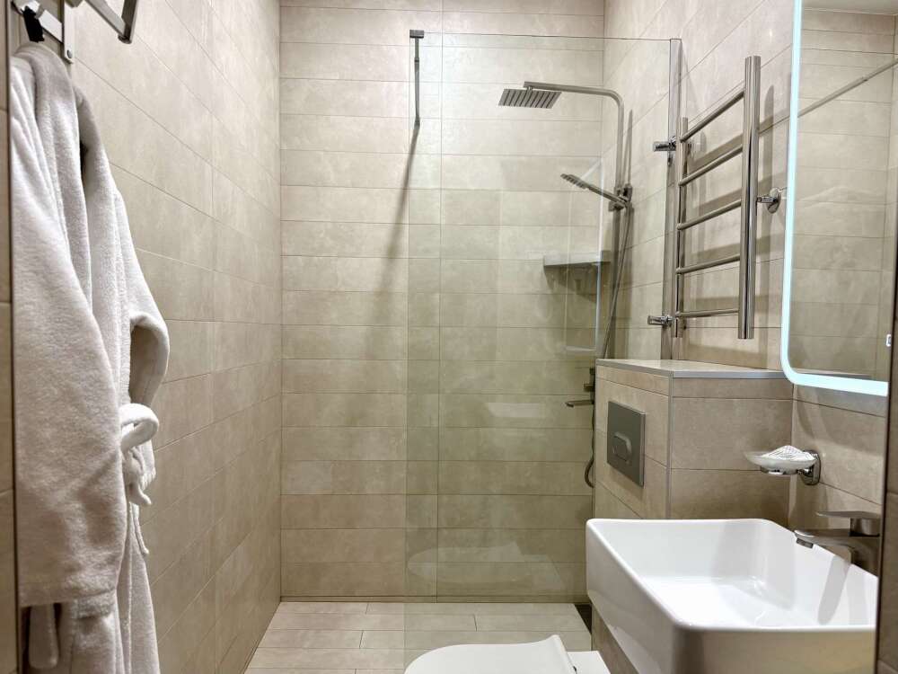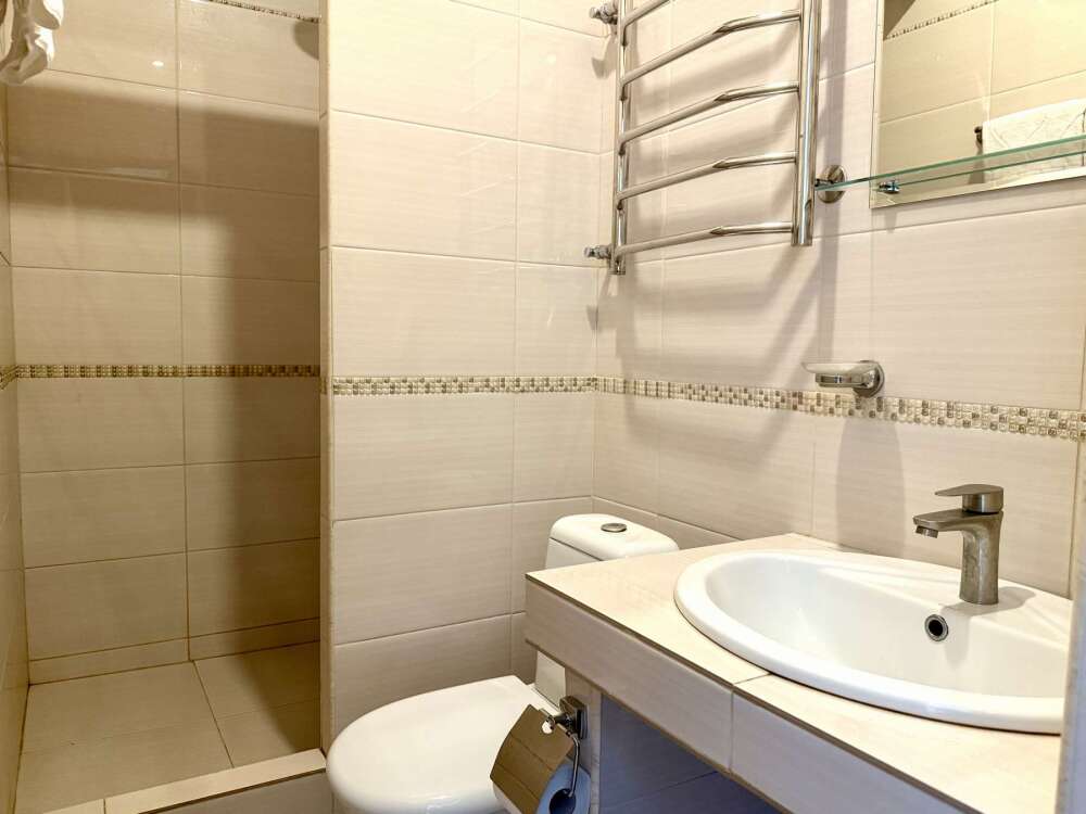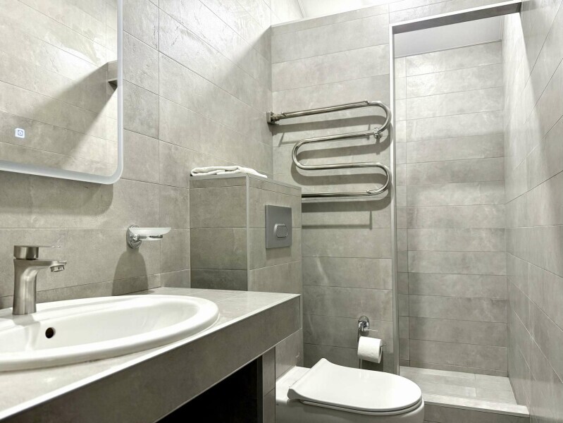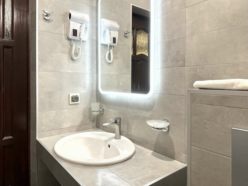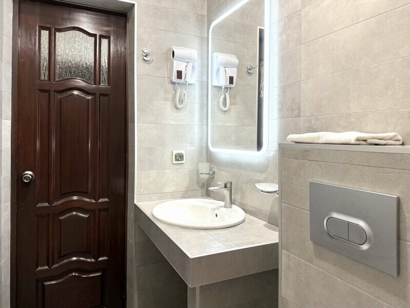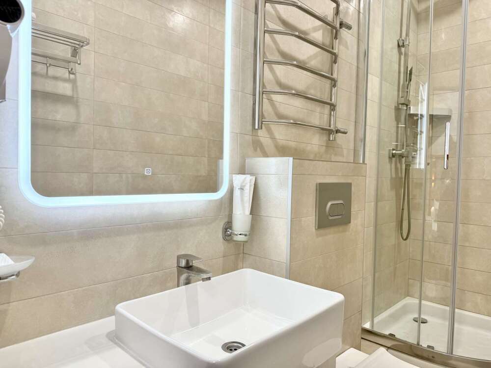 В ванной комнате: душевая кабина, индивидуальные одноразовые туалетные принадлежности (шампунь, мыло, гель), комплект полотенец, фен.