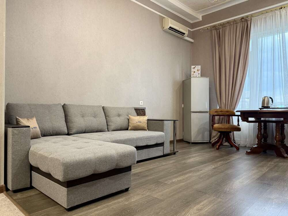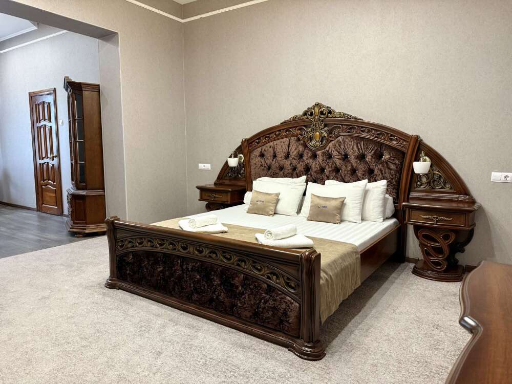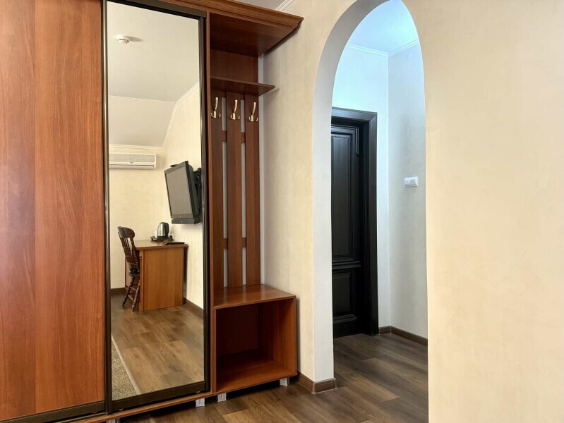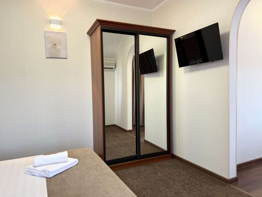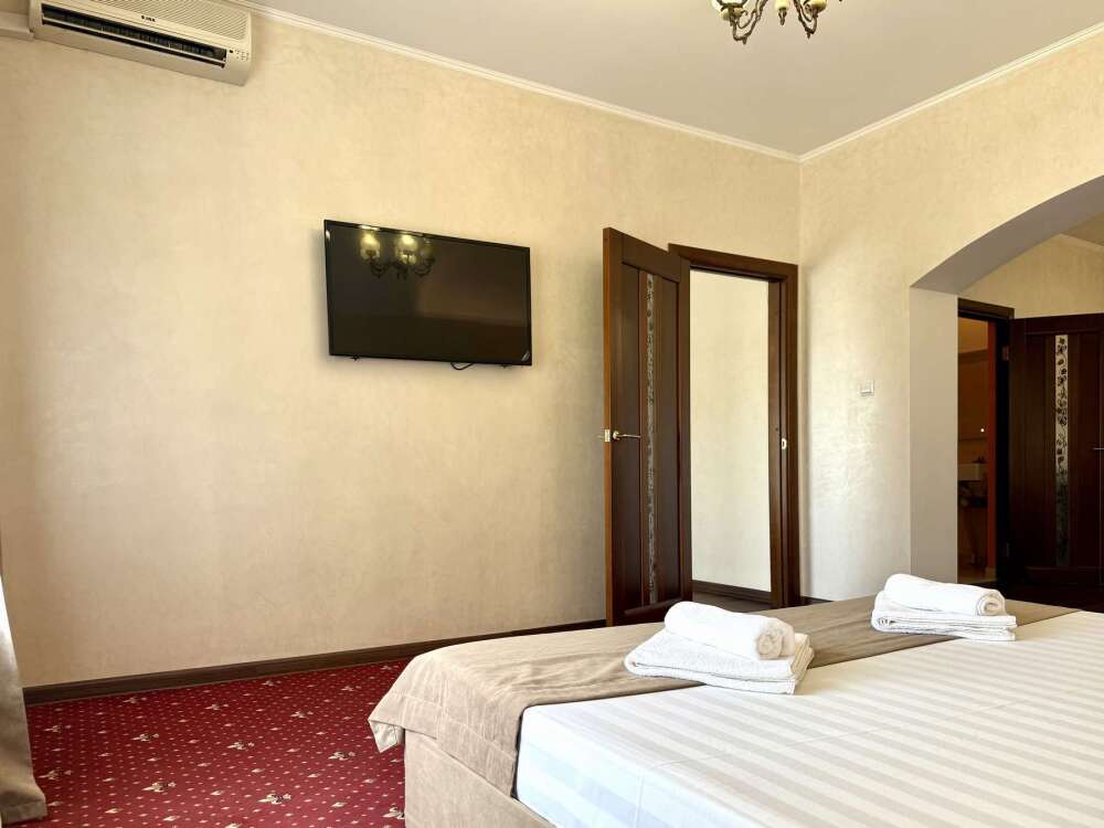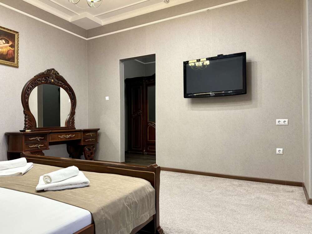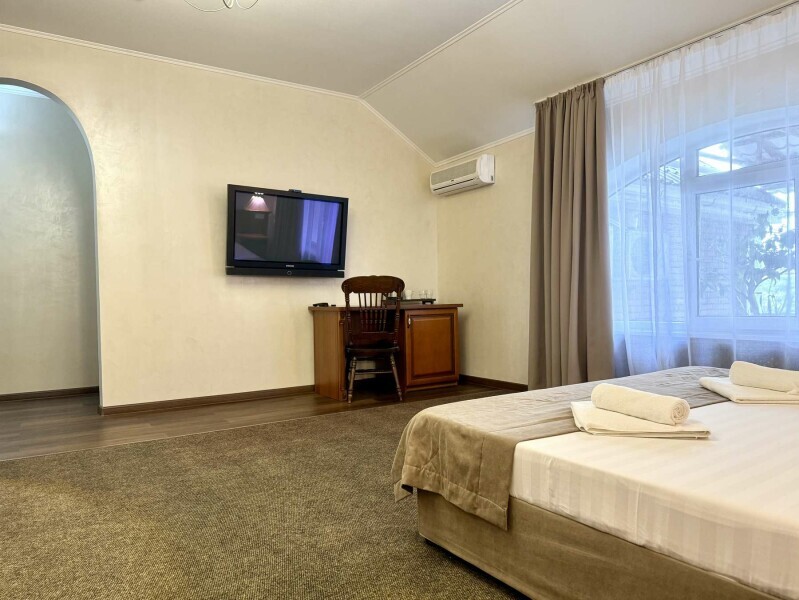В комнате: одна большая кровать (King size) и диван ,шкаф-купе с зеркалами, прикроватные тумбочки, светильники, стул-кресло, кондиционер, холодильник, электрочайник, телевизор, спутниковое ТВ, выход в Интернет Wi-Fi (бесплатно).