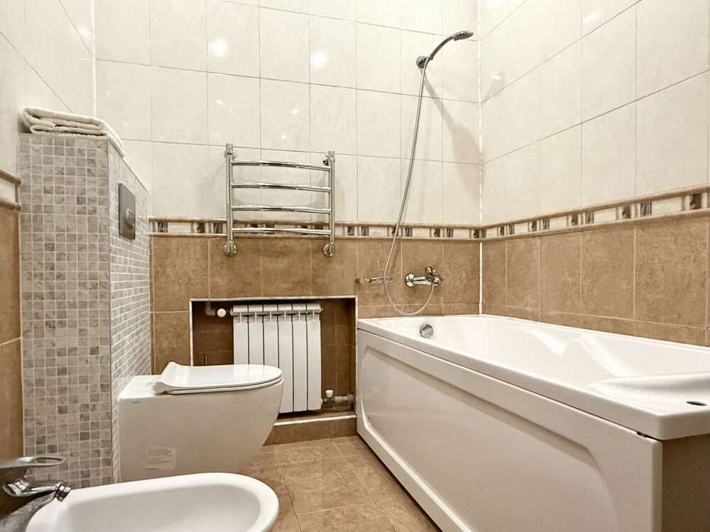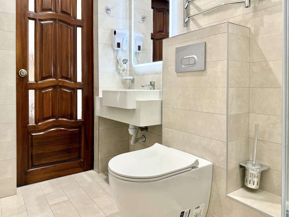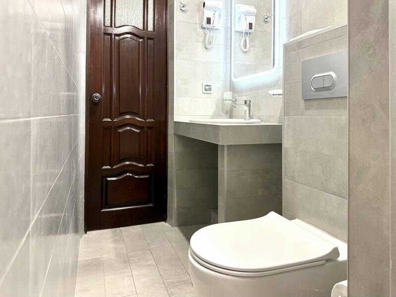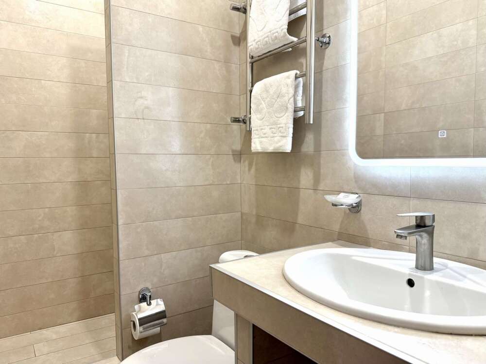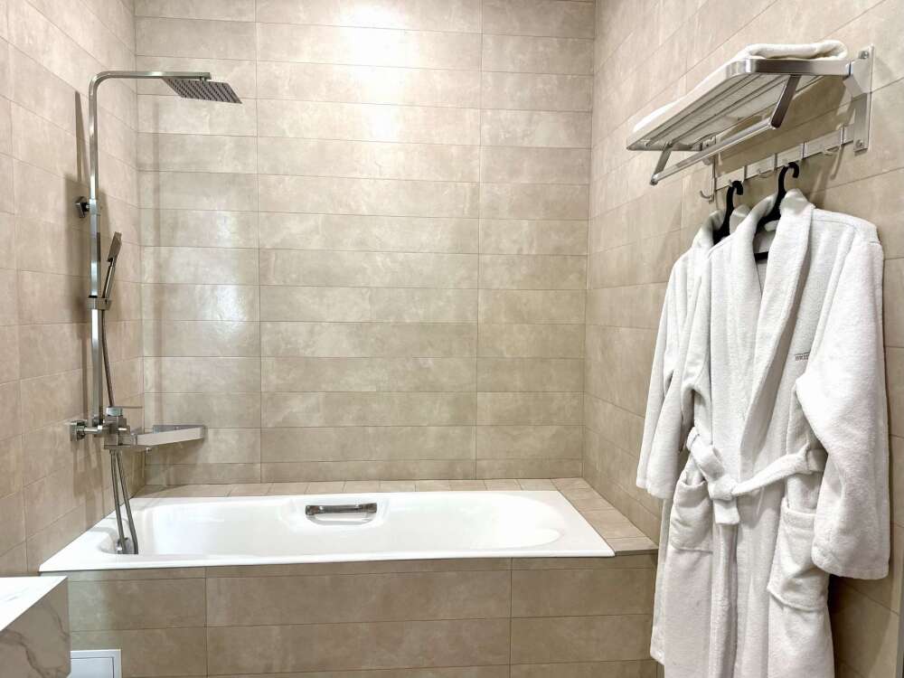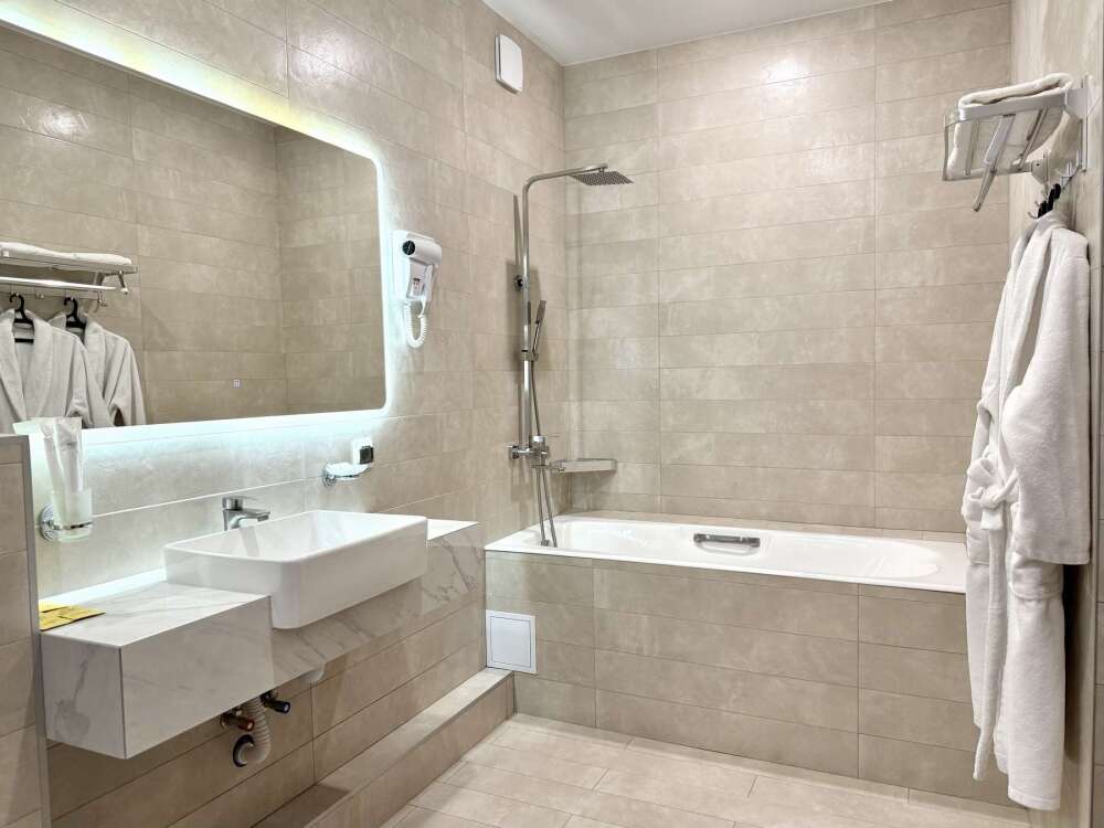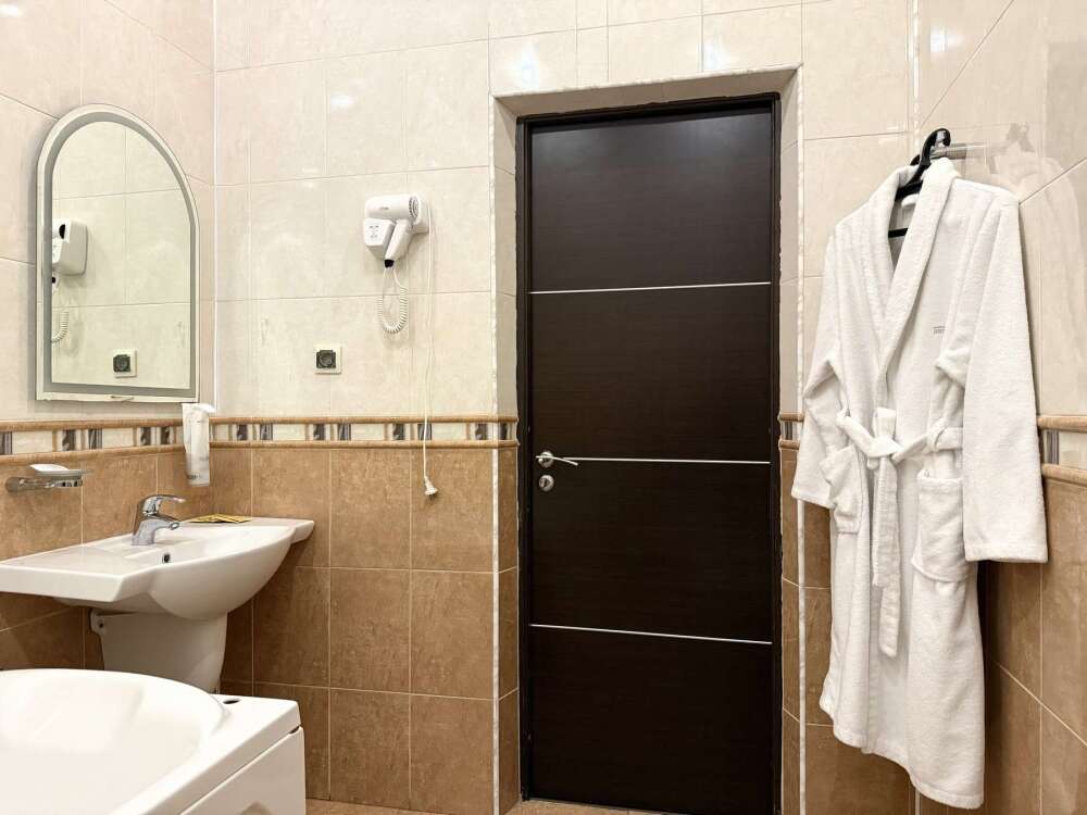 В сан узле ванная, душ, биде, фен. Предоставляются полотенца, тапочки, халаты и гигиенические принадлежности.