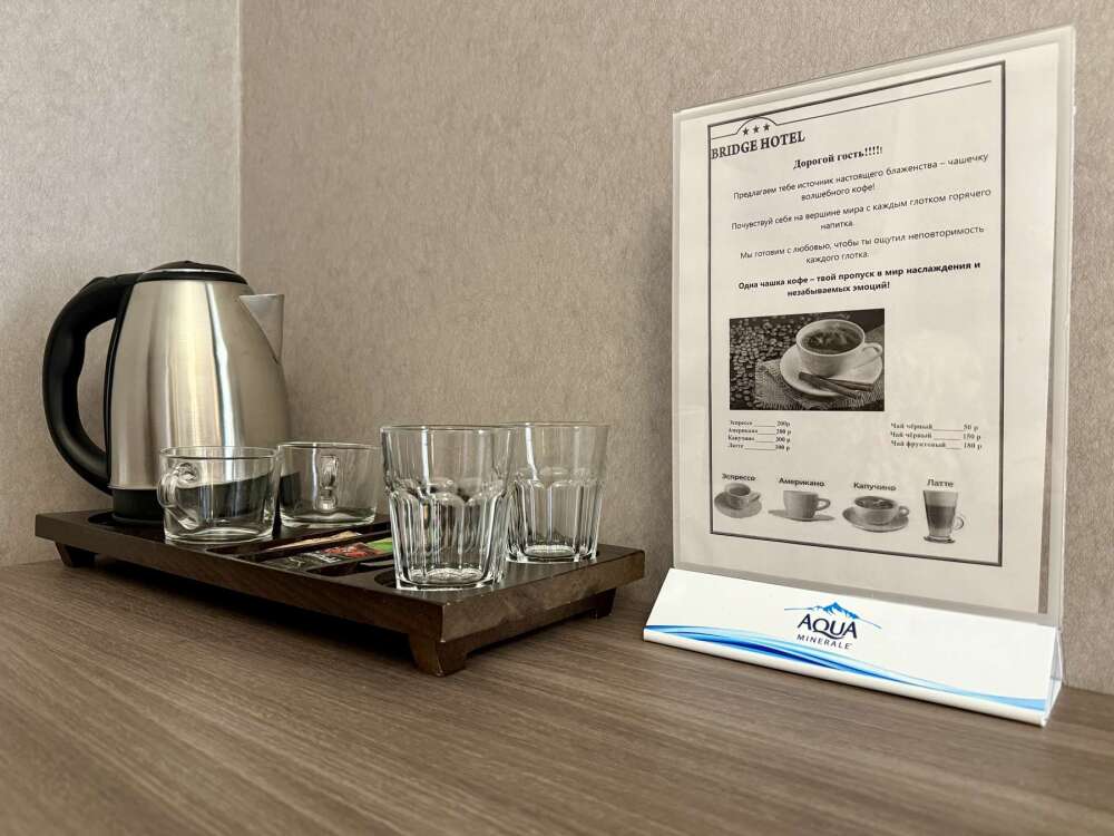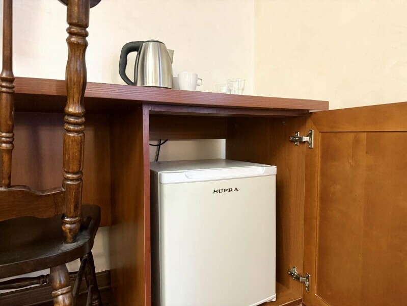 В номере одна большая кровать телевизор, бесплатный wi-fi, письменный стол, мини-холодильник, электрочайник, чайный набор.