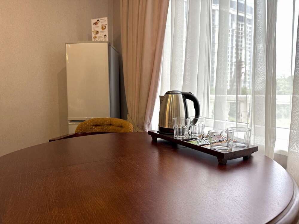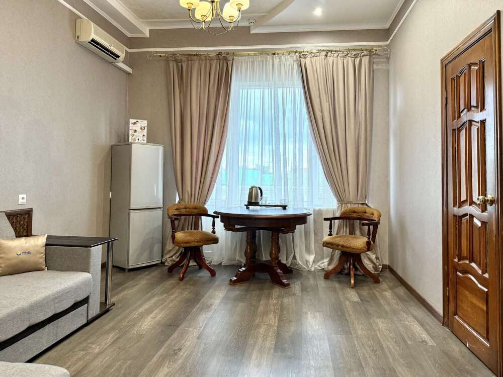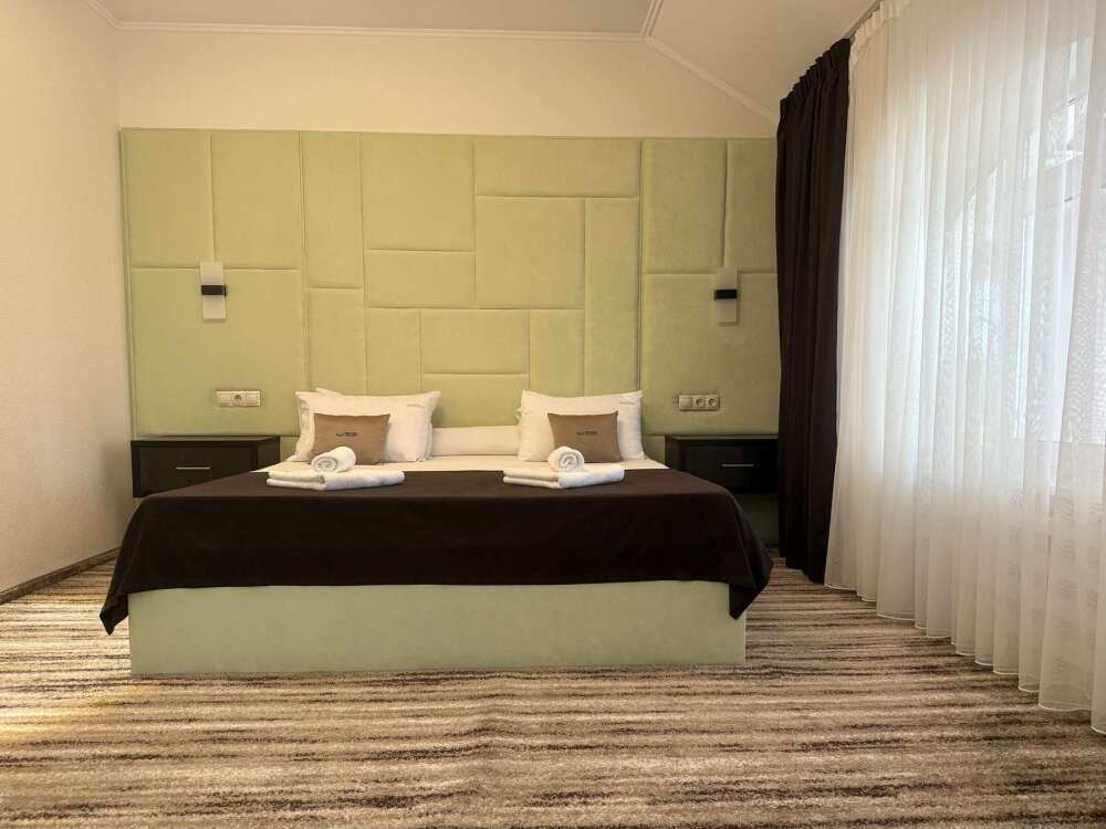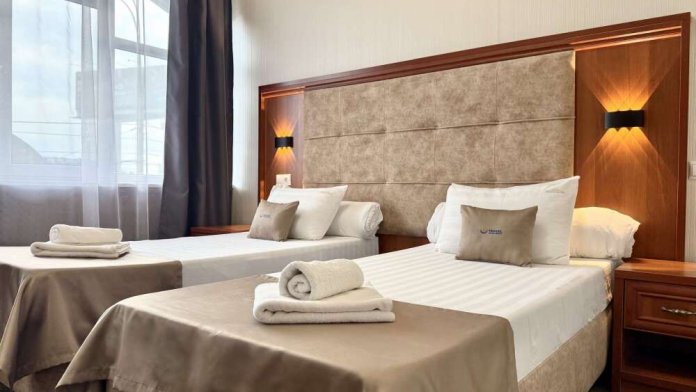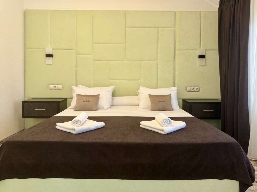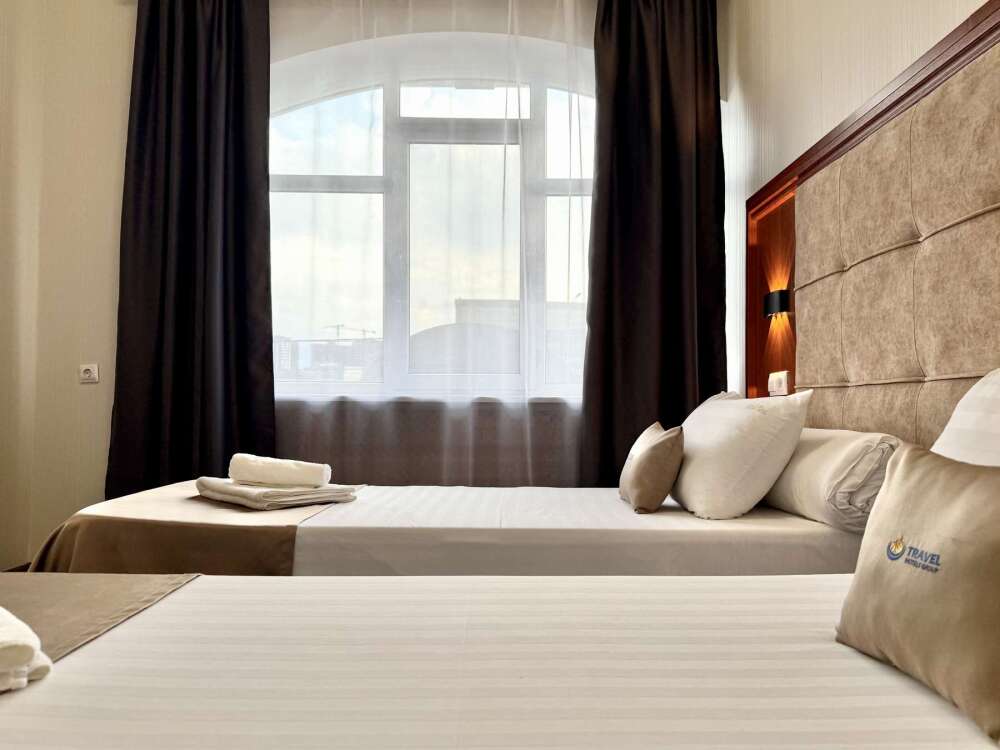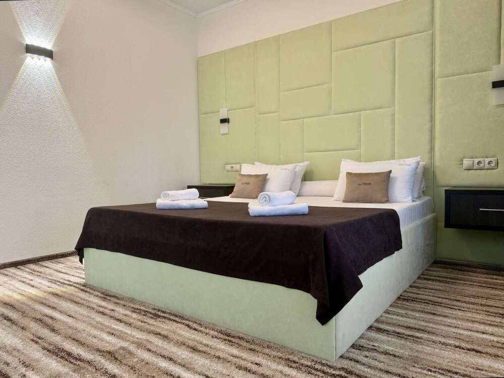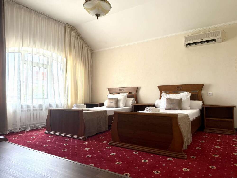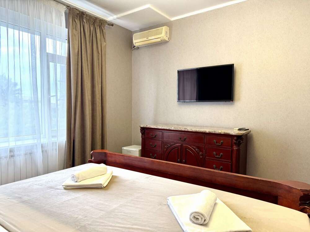 Свежий ремонт, удобные кровати. В номере: одна большая двуспальная кровать и раскладной двуспальный диван, прикроватные тумбы, шкаф/гардероб, телевизор, телефон, стол, холодильник, электрочайник и кондиционер.