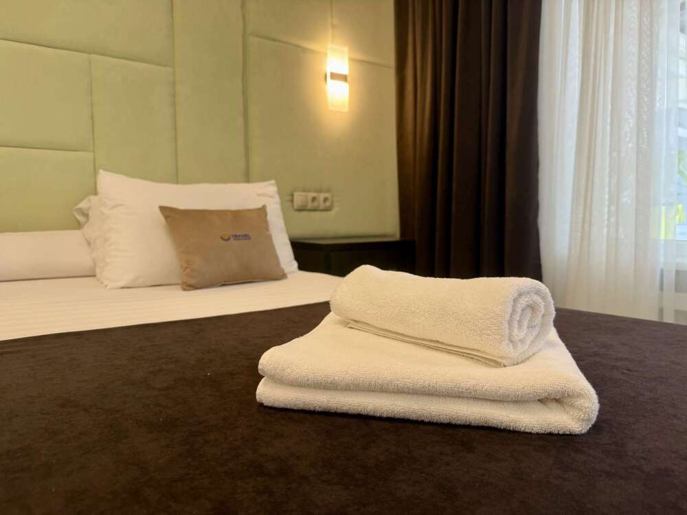 В номере есть кондиционер, Wi-Fi, затемняющие шторы, фен, телевизор, мини-холодильник, электрочайник. Предоставляется постельное бельё, полотенца и базовые средства гигиены.