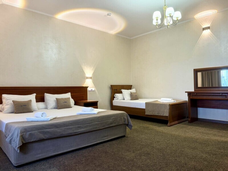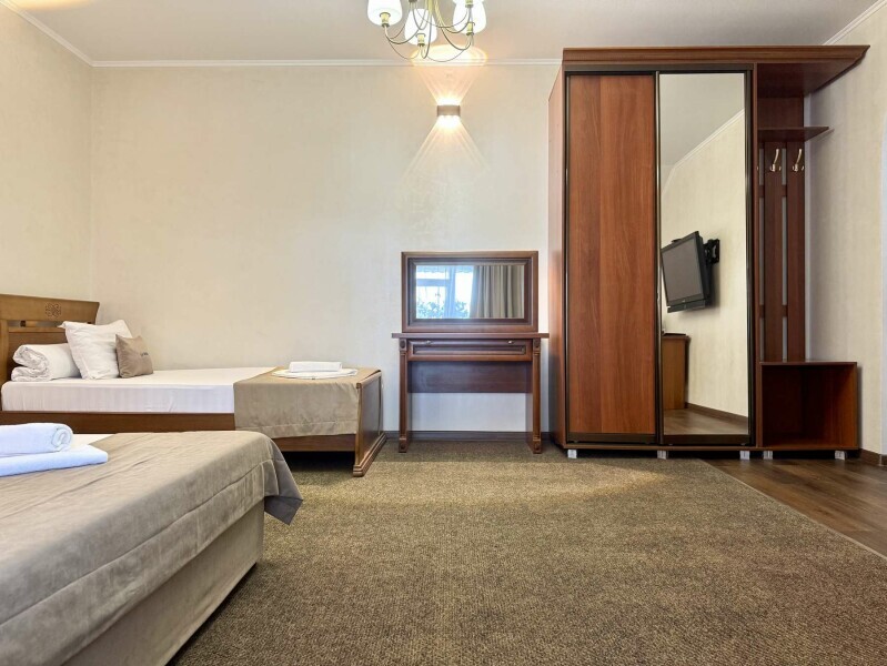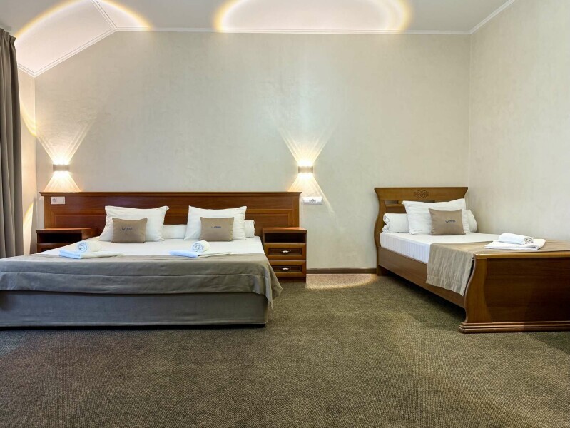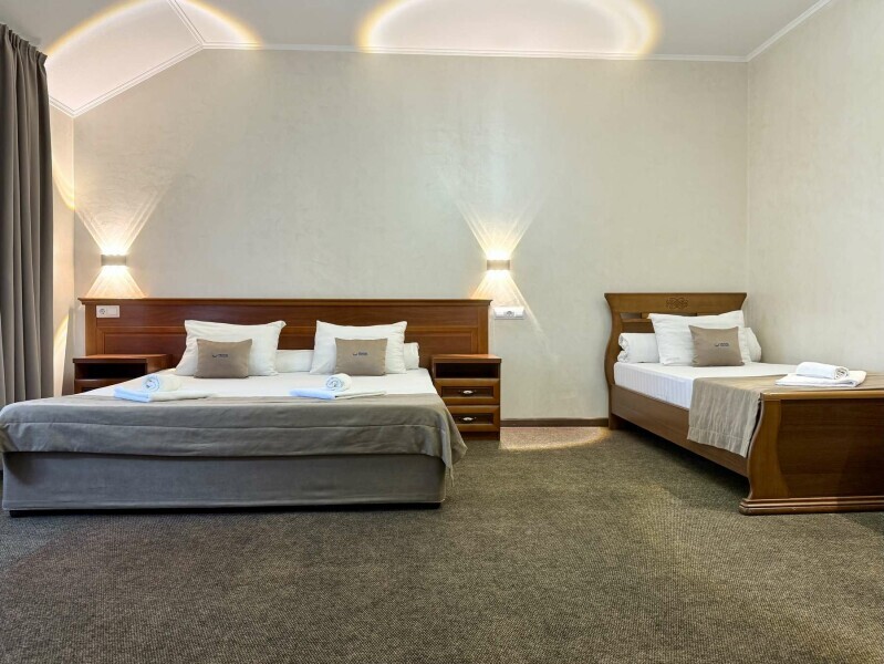 Данный номер отлично подойдёт и семьям с детьми. Свежий ремонт, удобные кровати. В номере: одна двуспальная кровать и диван, прикроватные тумбы, шкаф/гардероб, телевизор, телефон, стол, холодильник, электрочайник и кондиционер.