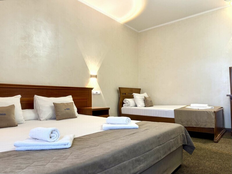 Уютный трехместный номер Стандарт с двуспальной и односпальной кроватями.