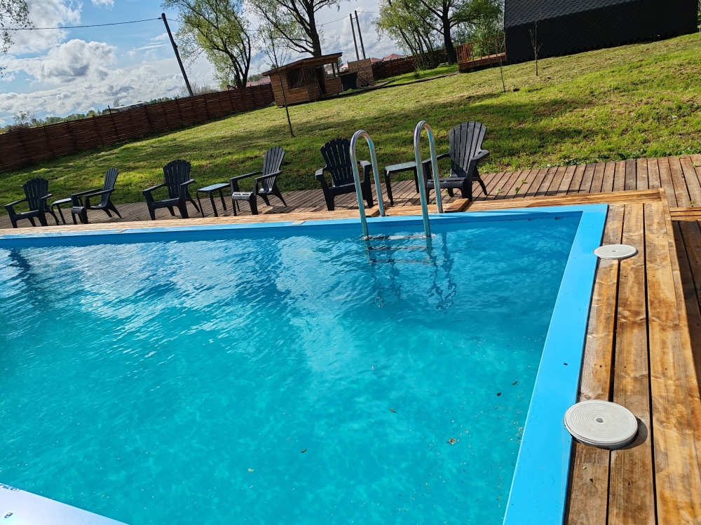 Глубокий подогреваемый бассейн – купайтесь в любое время! Зона отдыха с шезлонгами.