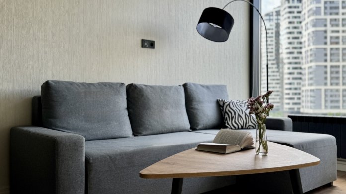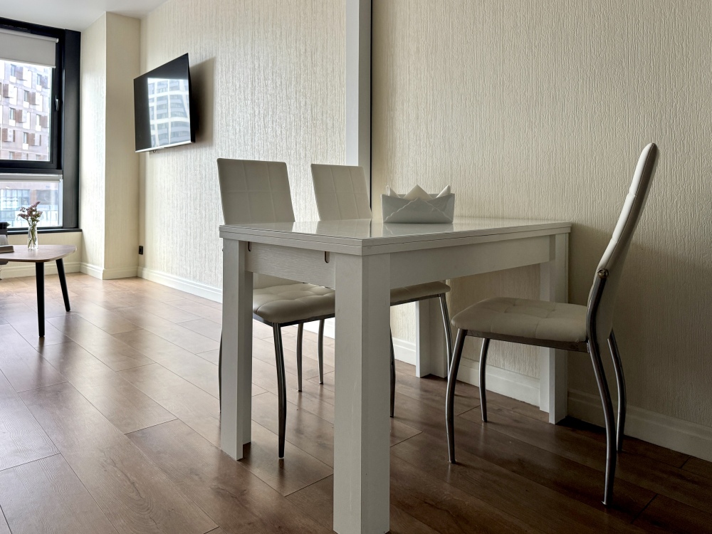 Апартаменты в бизнес-центре с панорамными окнами и неоклассическим интерьером.