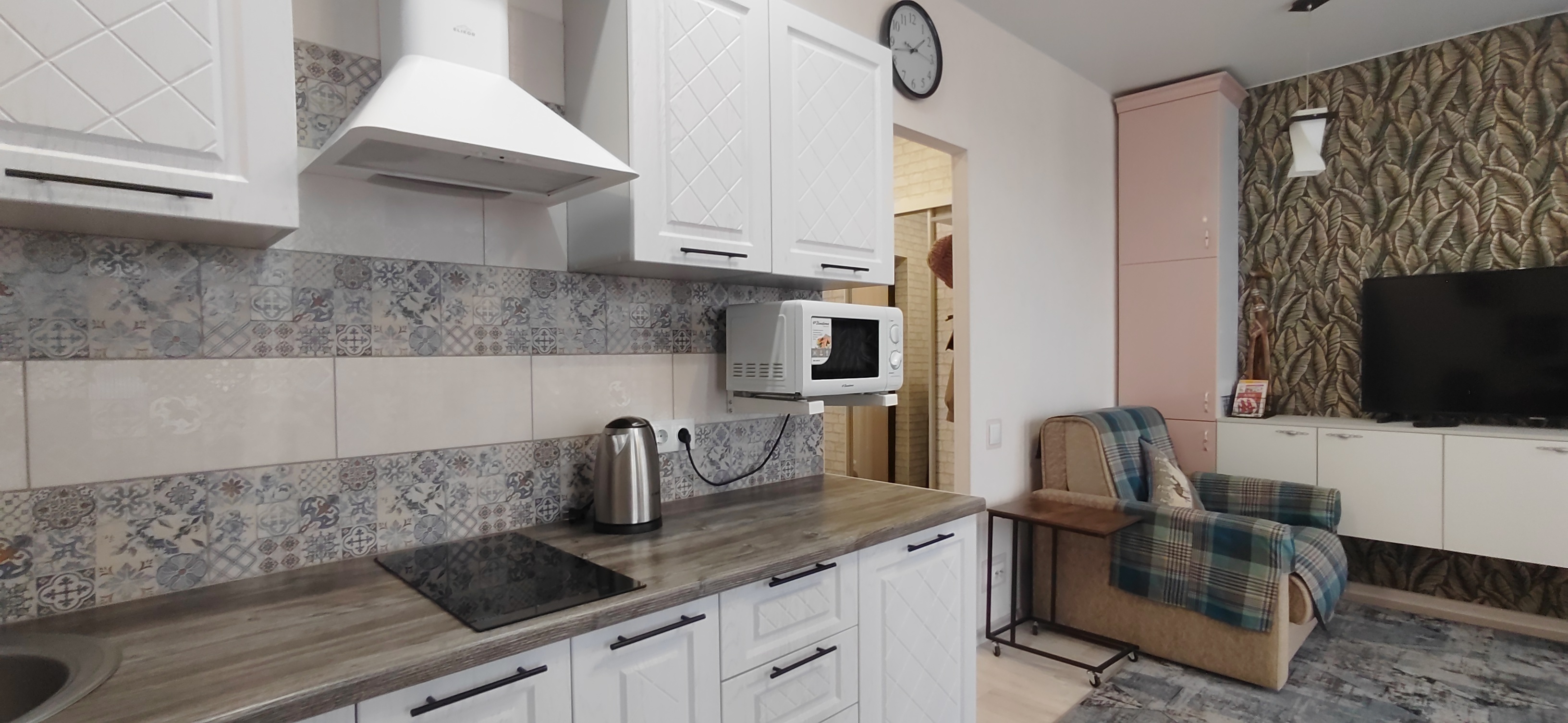 - Оборудованная кухня холодильник, микроволновка, электроплита, чайник и вся необходимая посуда позволят готовить любимые блюда с удовольствием;