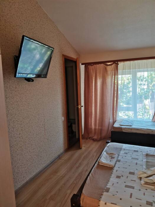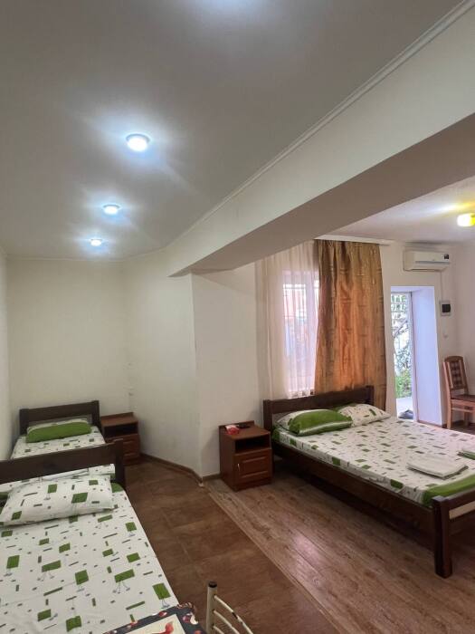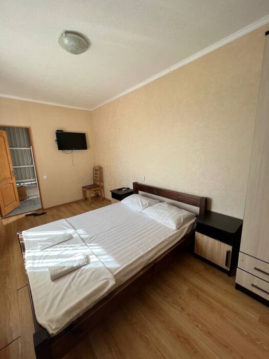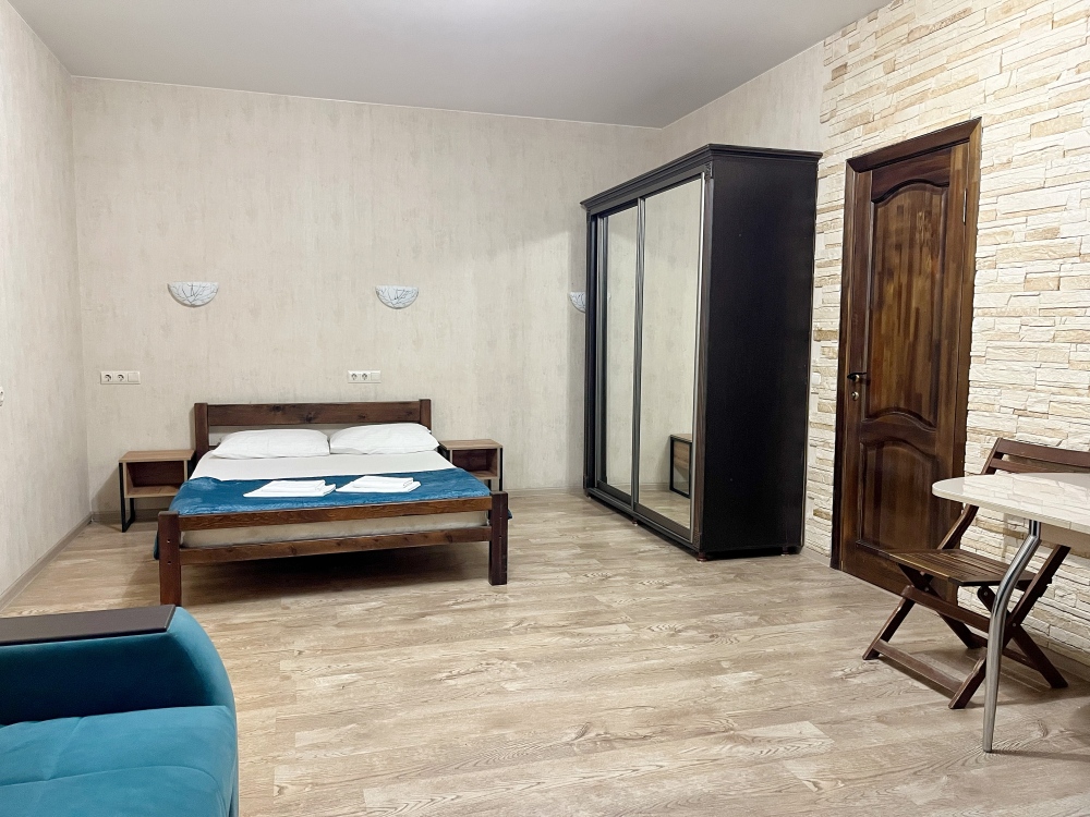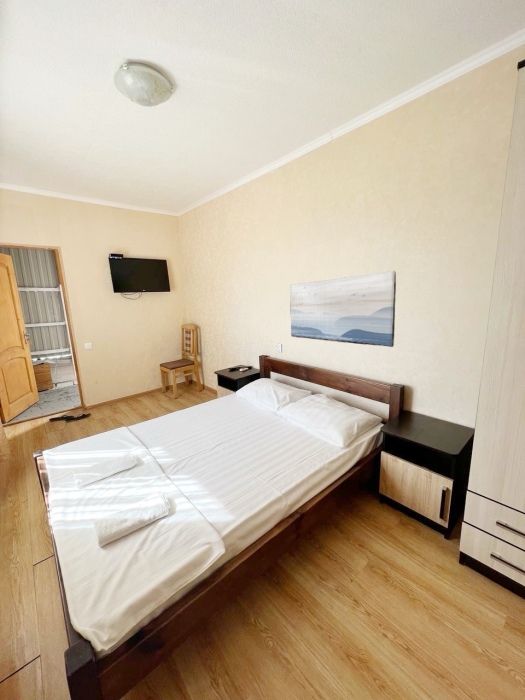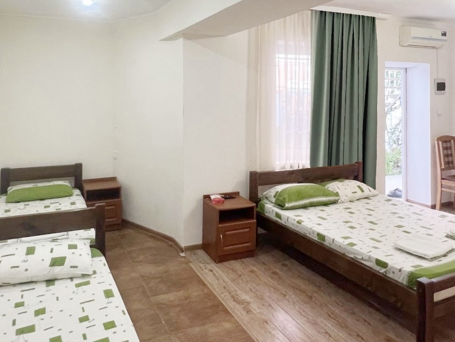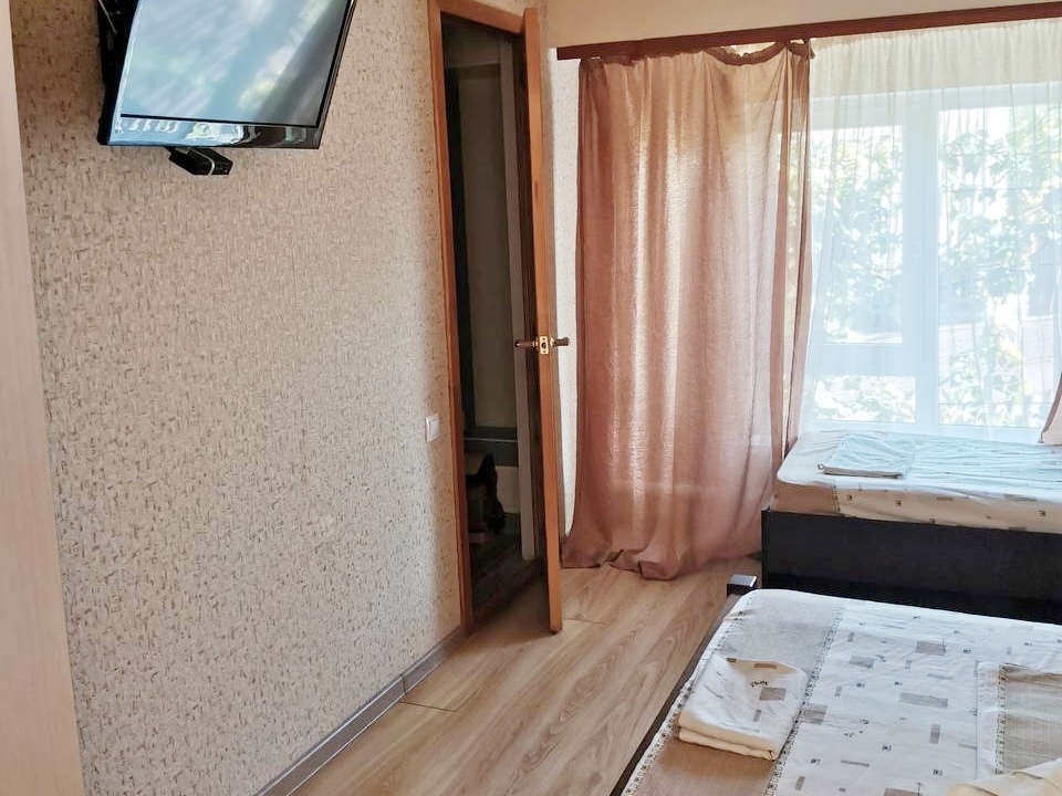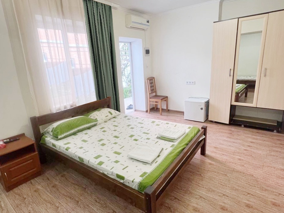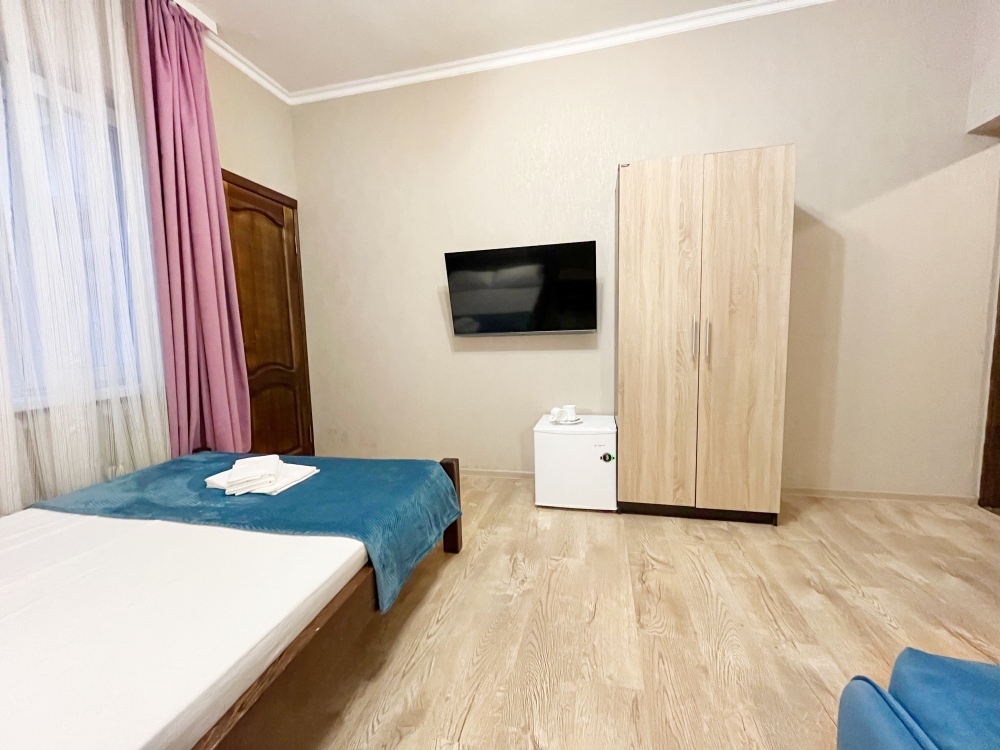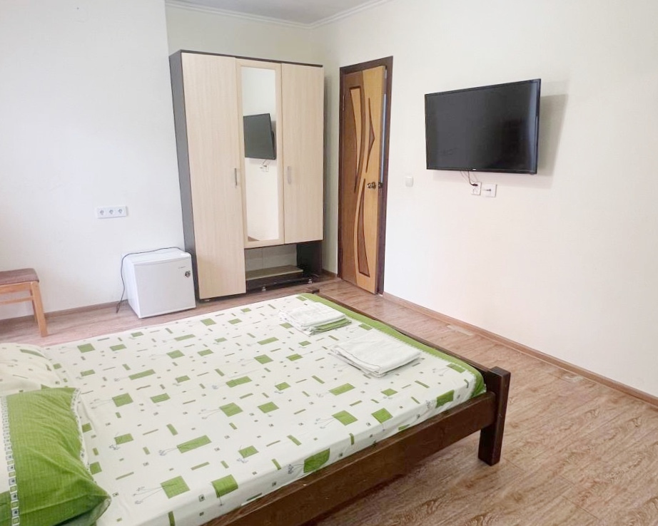 В номере имеется двуспальная кровать, комфортный диван-кровать с ортопедическим основанием на двоих, смарт-телевизор, небольшой холодильник, сплит. система, шкаф для одежды, тумбочки, стол, возможность поставить доп. место (ортопедическая раскладушка). Сан узел (душ, унитаз, раковина) в номере. На этаже находится общая кухня на 4 номера с обеденными зонами