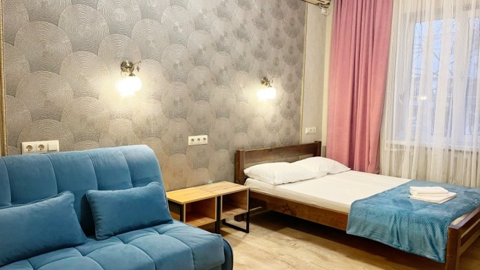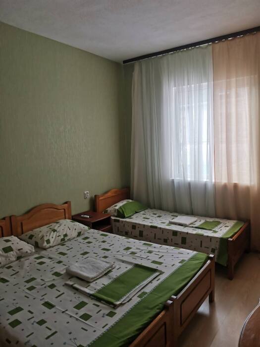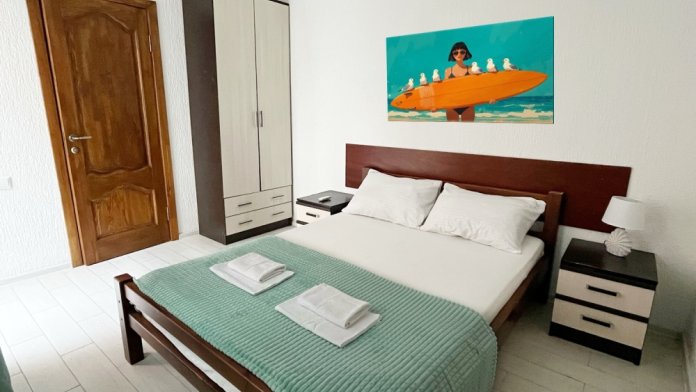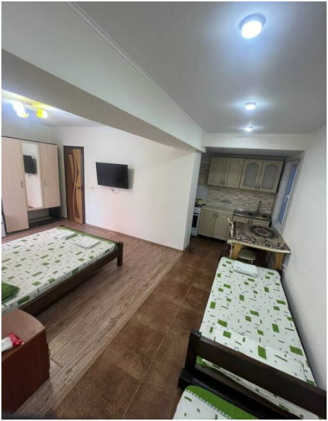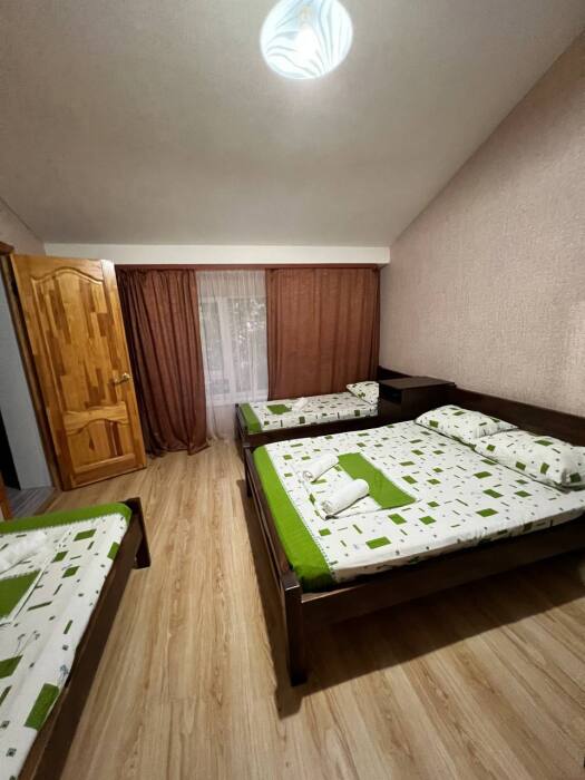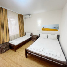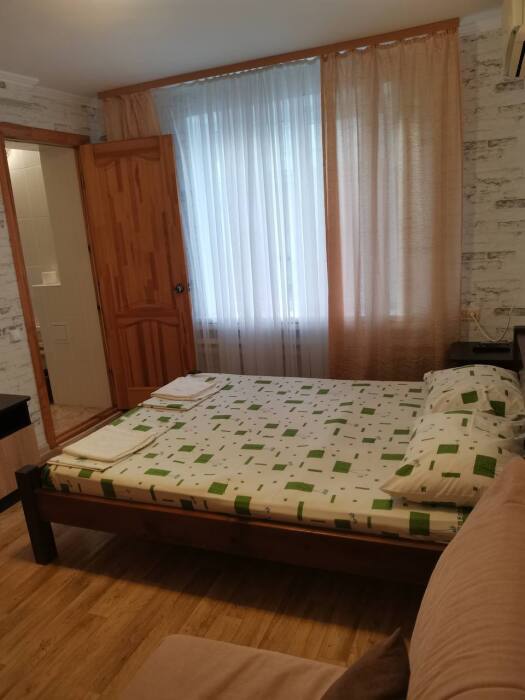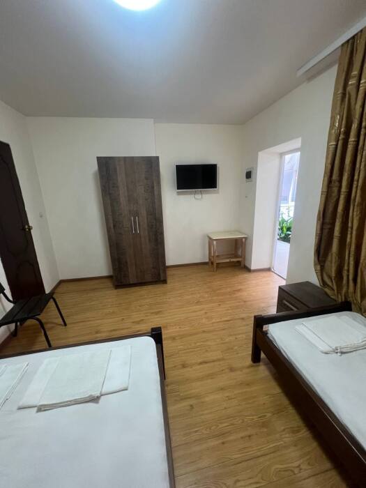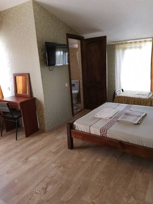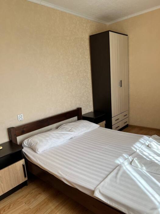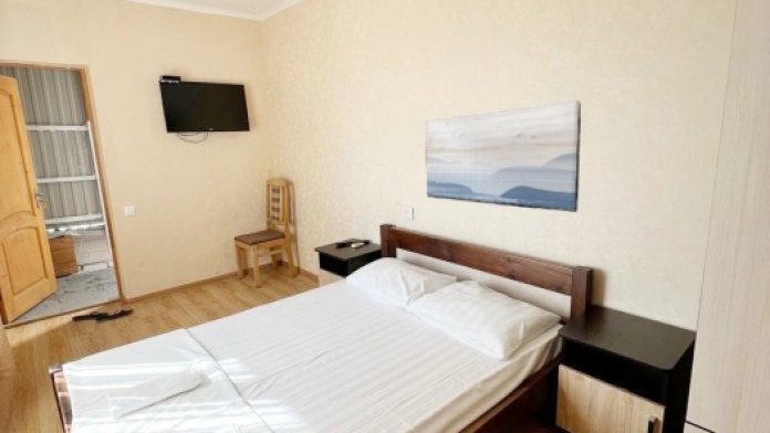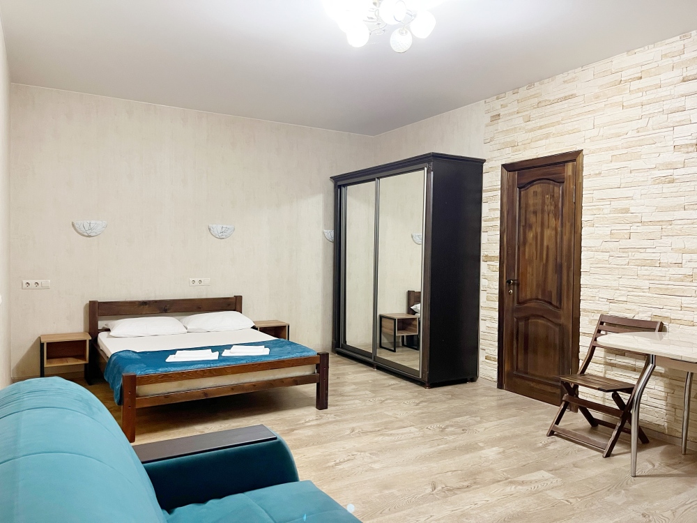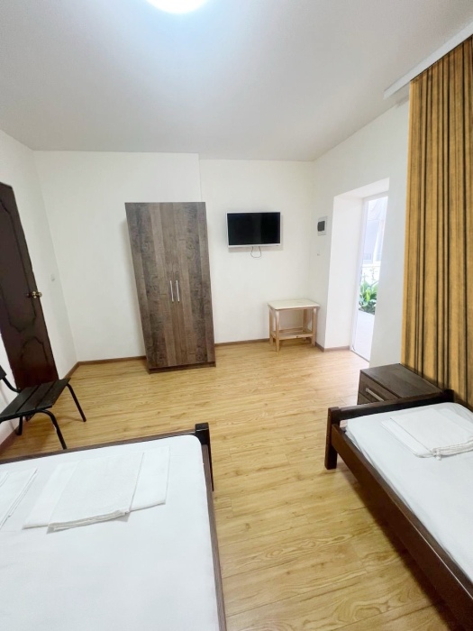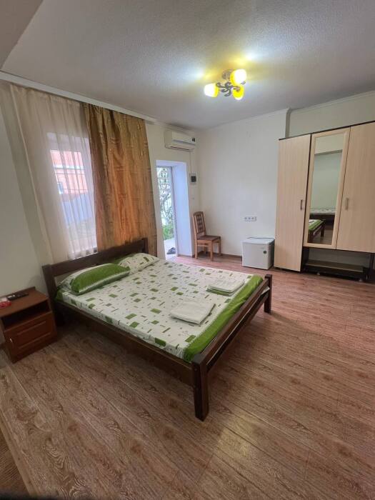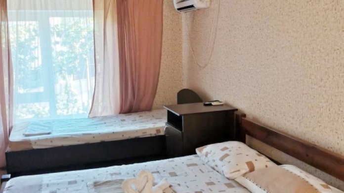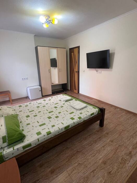 В номере имеется двуспальная кровать, комфортный диван-кровать с ортопедическим основанием на двоих, смарт-телевизор, небольшой холодильник, сплит. система, шкаф для одежды, тумбочки, стол, возможность поставить доп. место (ортопедическая раскладушка). Сан узел (душ, унитаз, раковина) в номере. На этаже находится общая кухня на 4 номера с обеденными зонами