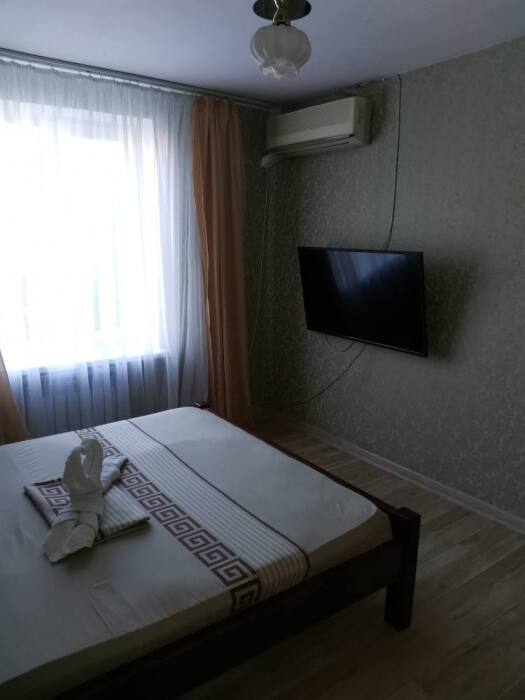 В номере двуспальная и односпальная кровати. Шкаф для одежды, тумбочки, небольшой холодильник, смарт-телевизор, сплит.система.