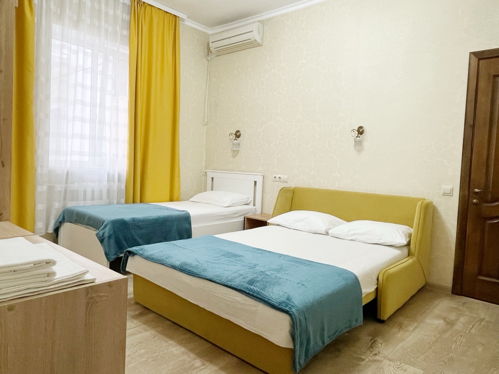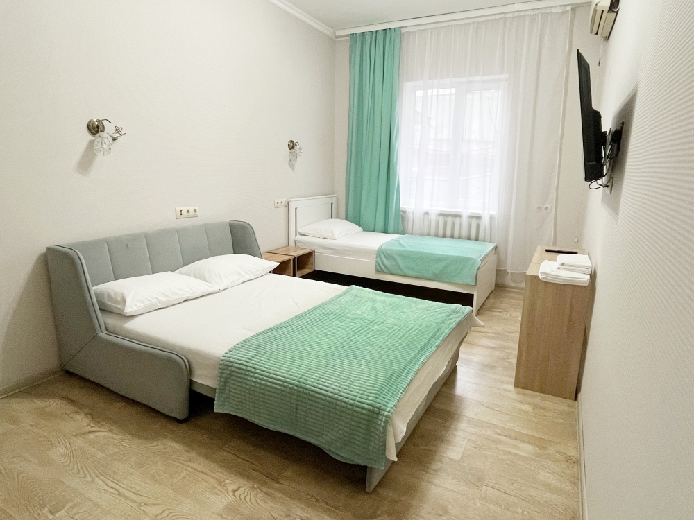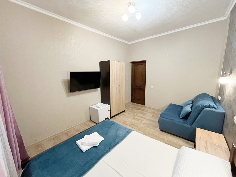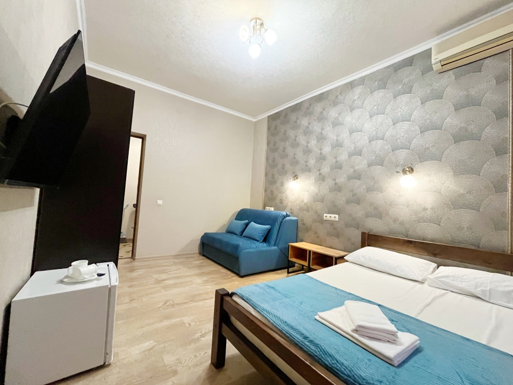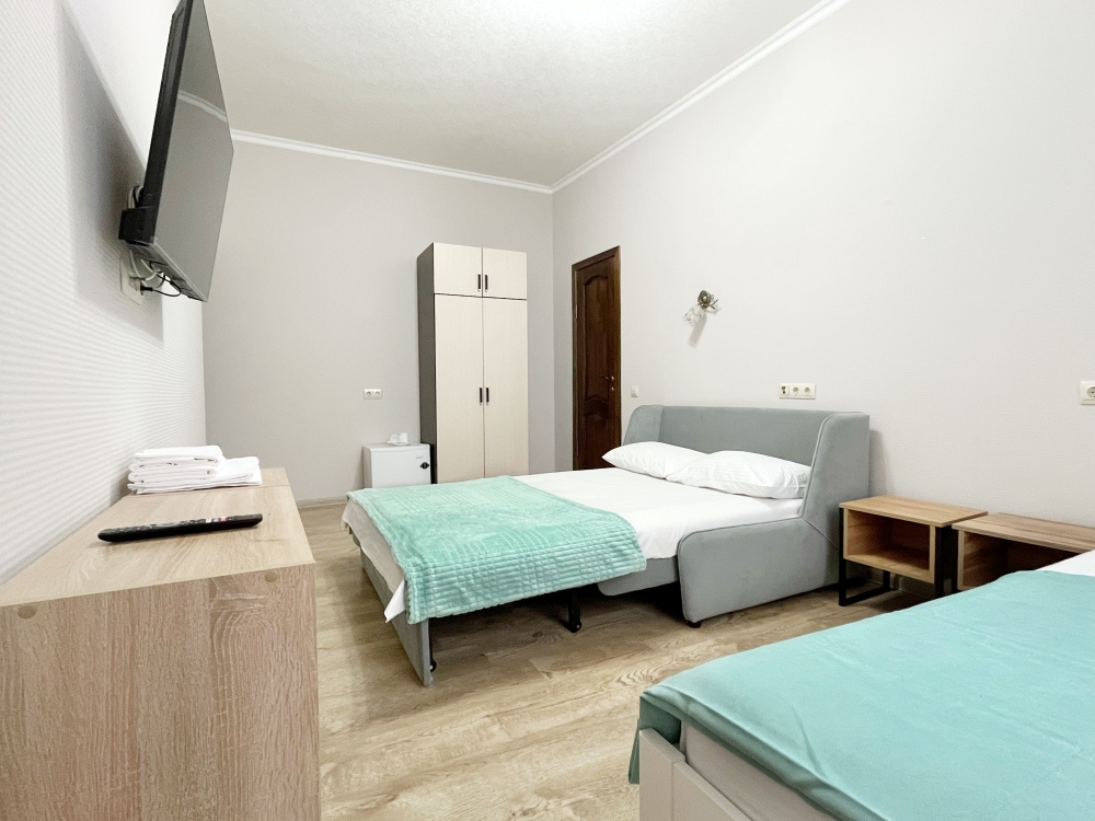В номере имеется комфортный ортопедический диван-кровать (ширина 140см), односпальная кровать, смарт-телевизор, небольшой холодильник, сплит. система, шкаф для одежды, тумбочки. Сан узел (душ, унитаз, раковина) в номере.