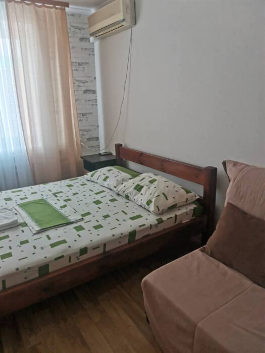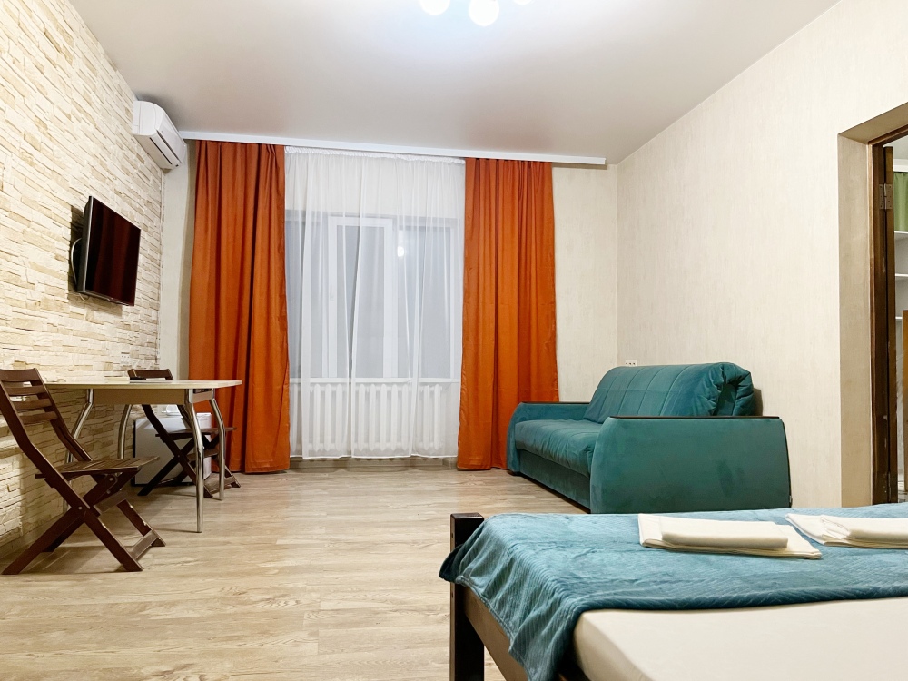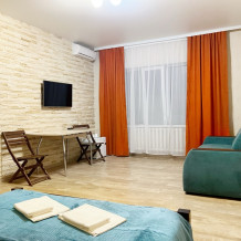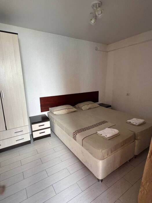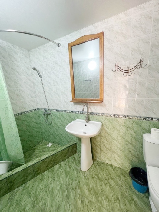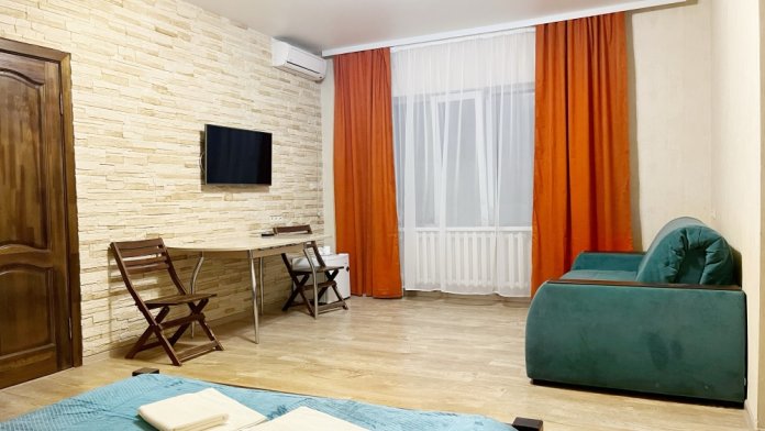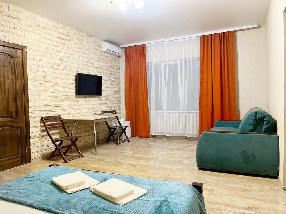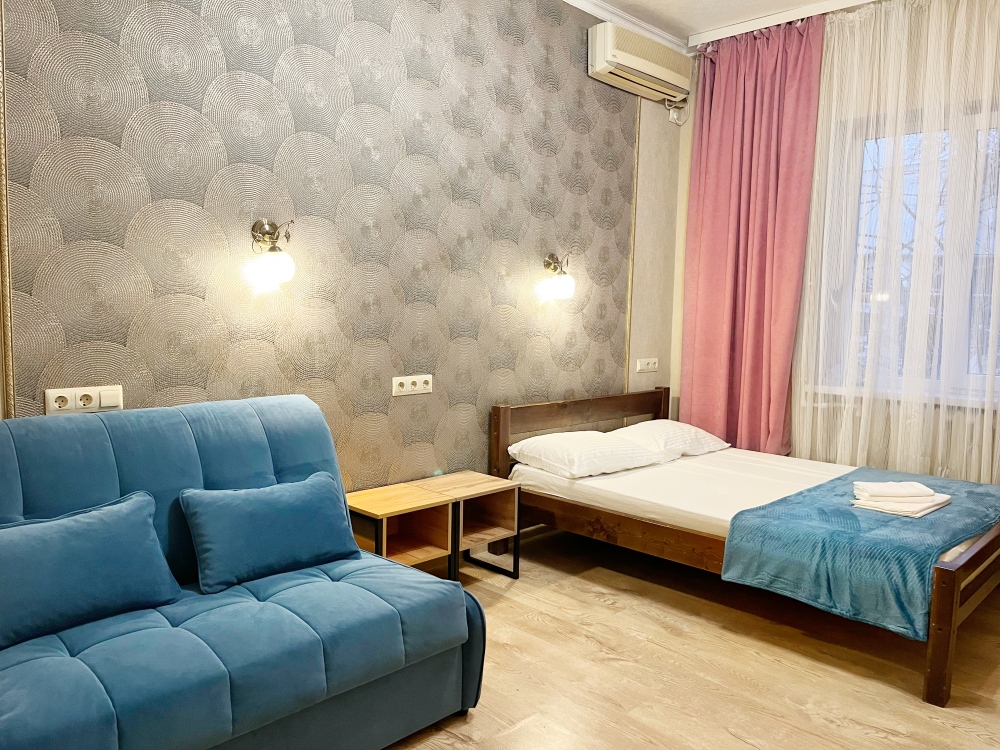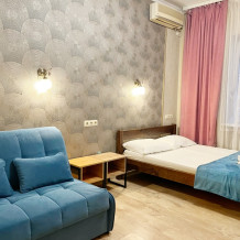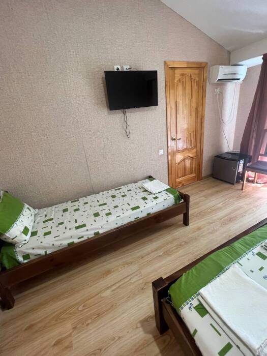 В номере имеется комфортный ортопедический диван-кровать (ширина 140см), односпальная кровать, смарт-телевизор, небольшой холодильник, сплит. система, шкаф для одежды, тумбочки. Сан узел (душ, унитаз, раковина) в номере.