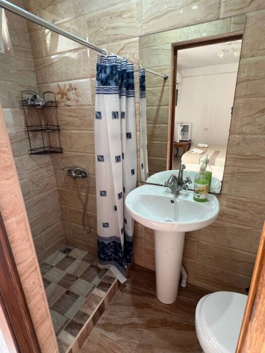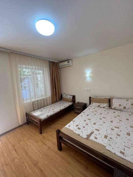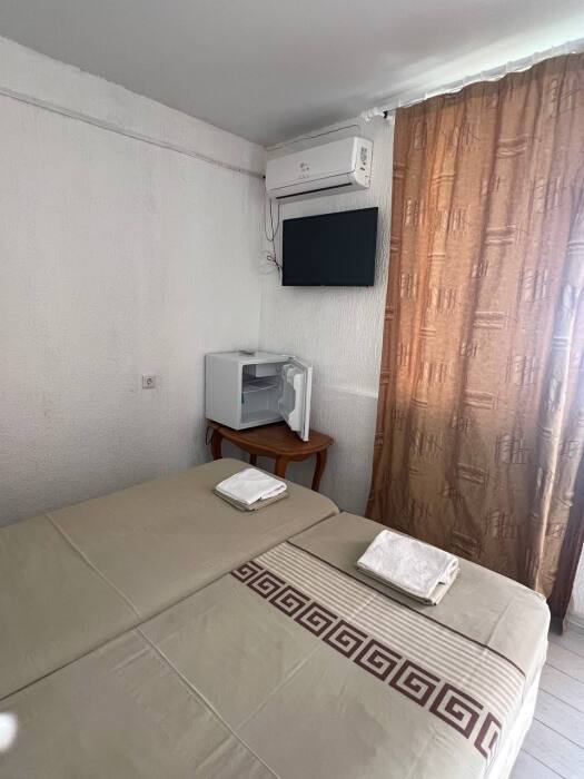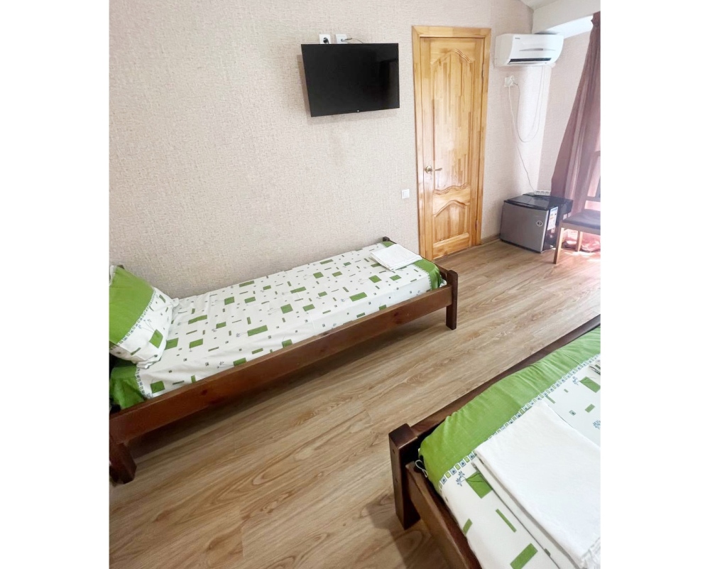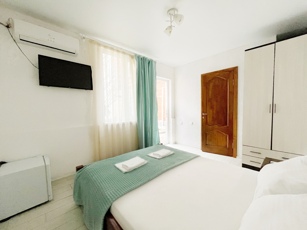 Номер находится на первом этаже гостевого дома. Номер на двоих гостей, имеются тумбочки, шкаф для одежды, компактный холодильник, сплит. система, смарт-телевизор. В номере сан. узел (душ, унитаз, раковина)