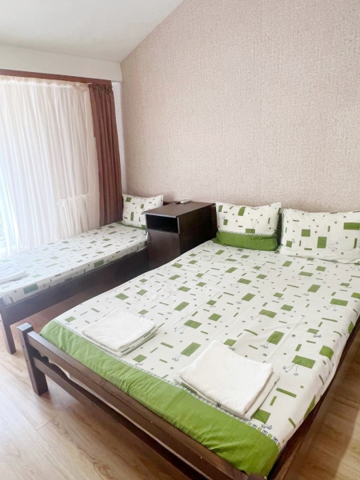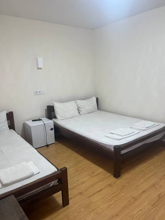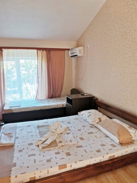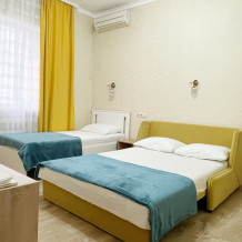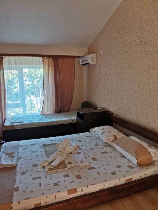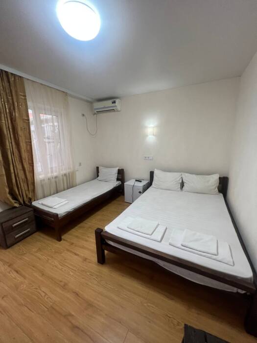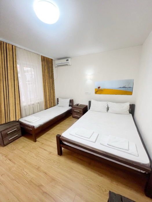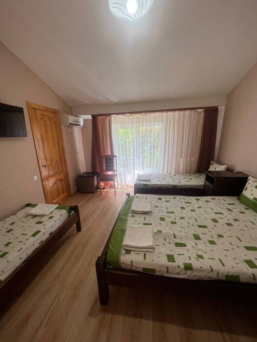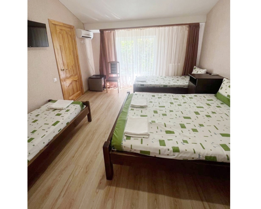 В номере имеется двуспальная кровать, две односпальные кровати, небольшой холодильник, сплит. система, шкаф для одежды, тумбочки.