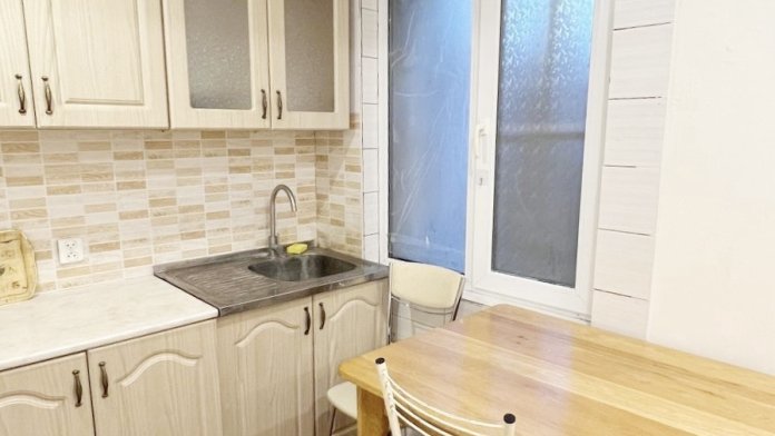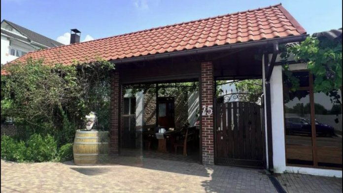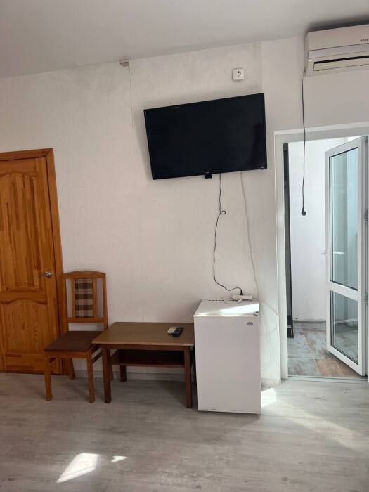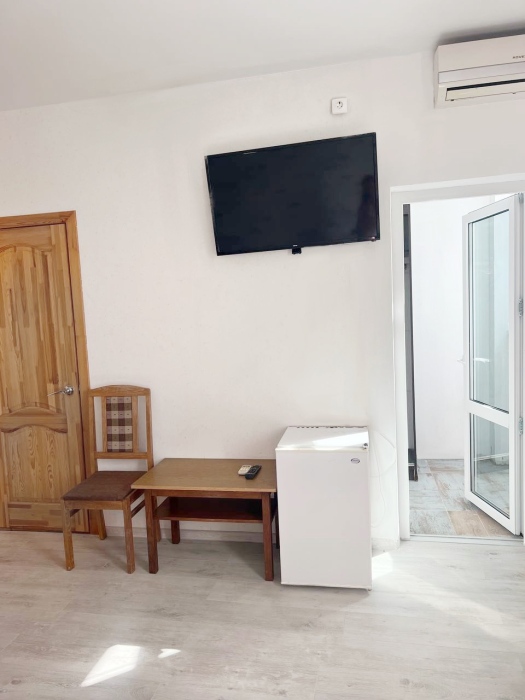 Номер находится на первом этаже гостевого дома, с отдельным входом и небольшим балконом с мебелью (стол, стулья)