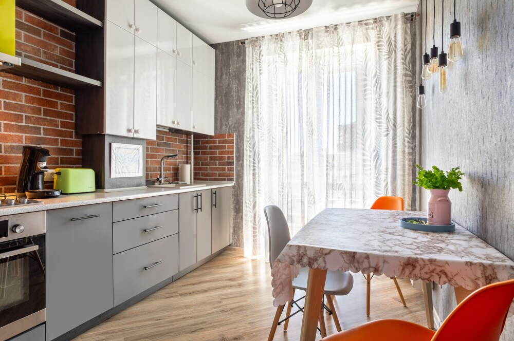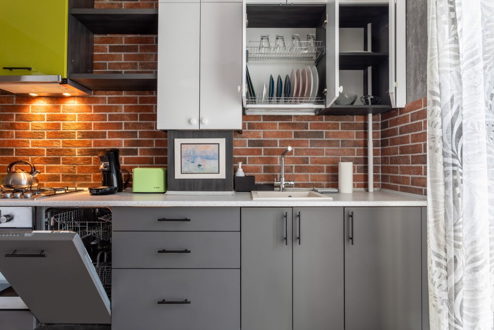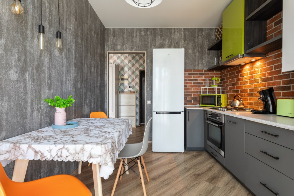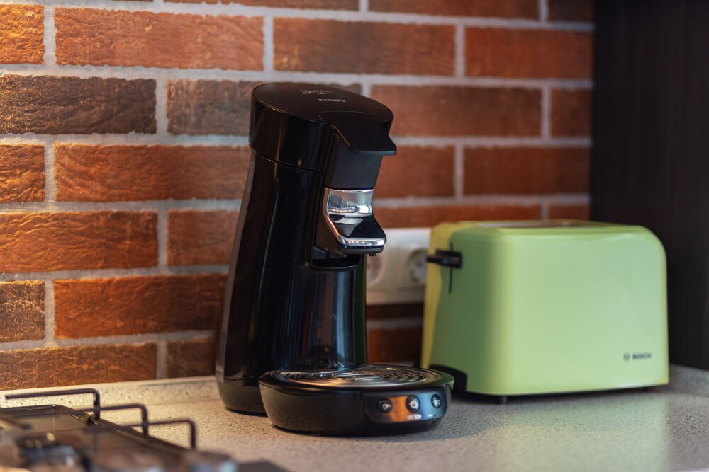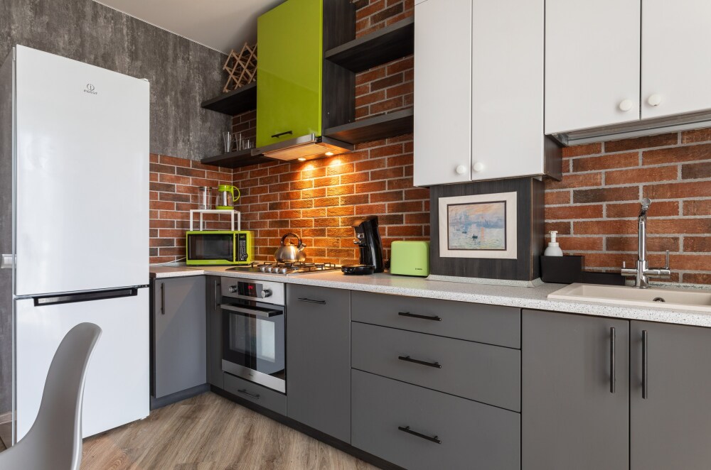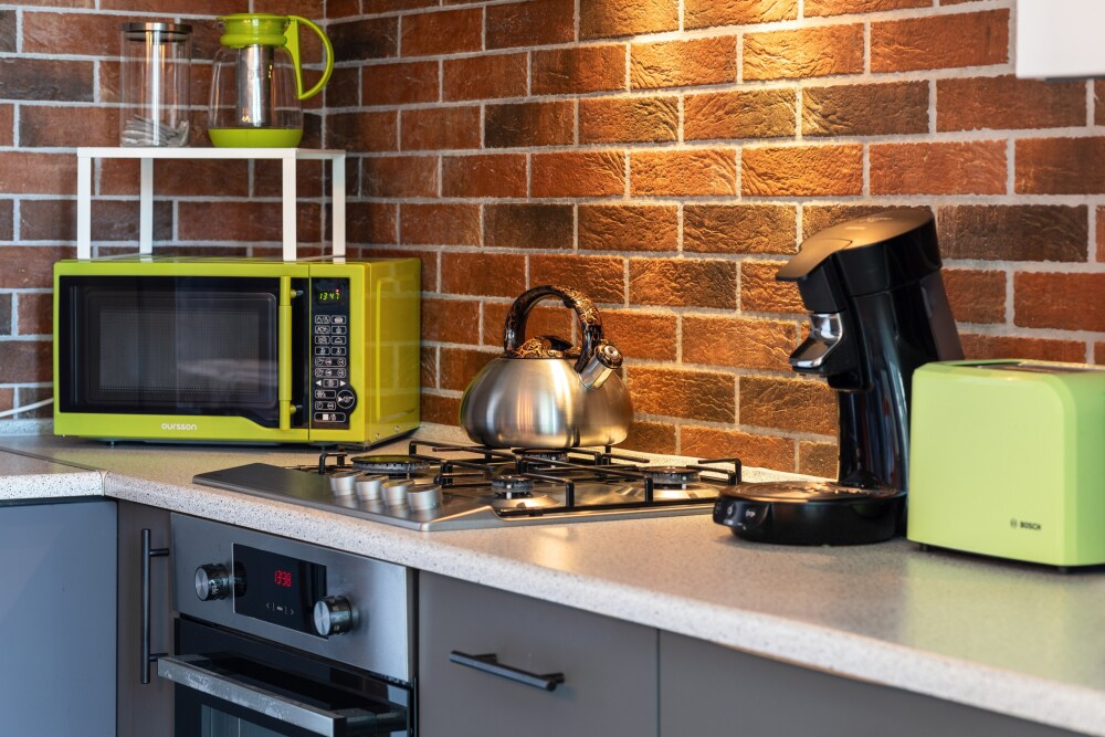 Кухня оснащена: варочной панелью, духовкой, СВЧ-печью, электрическим чайником, тостером, холодильником и посудомойкой.