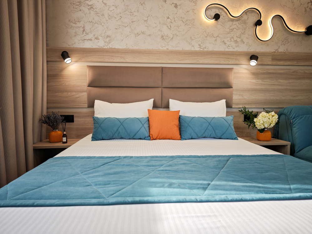 Удобная двухспальная кровать с ортопедическим матрасом.