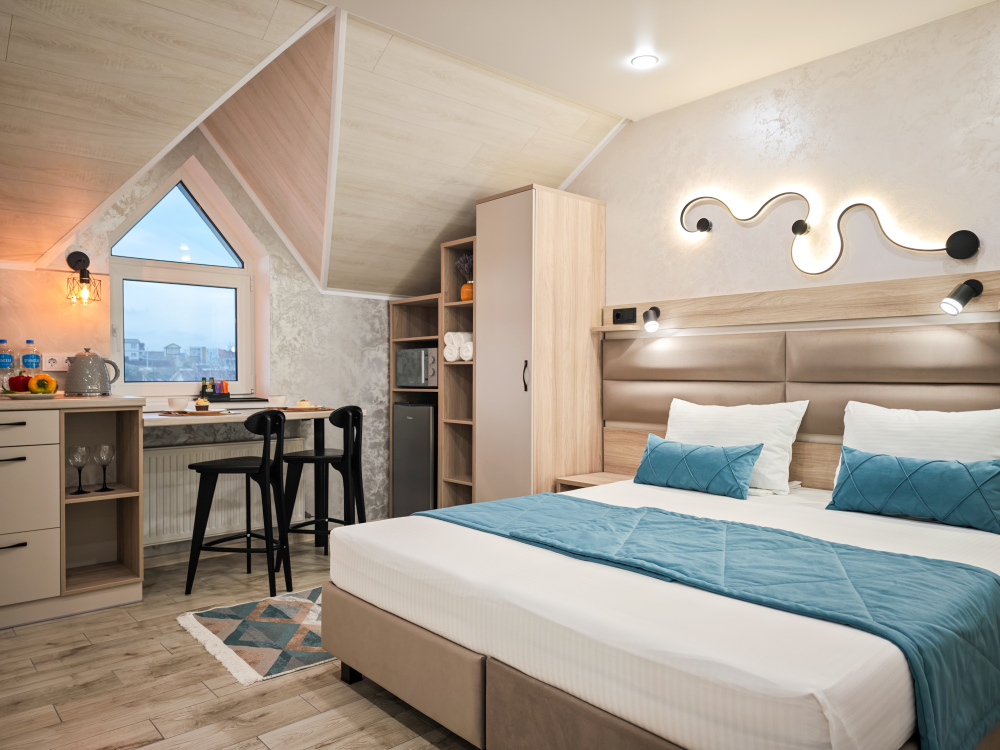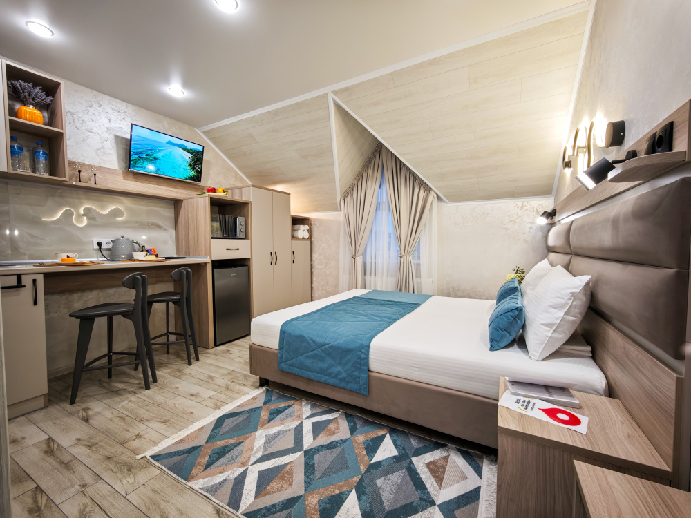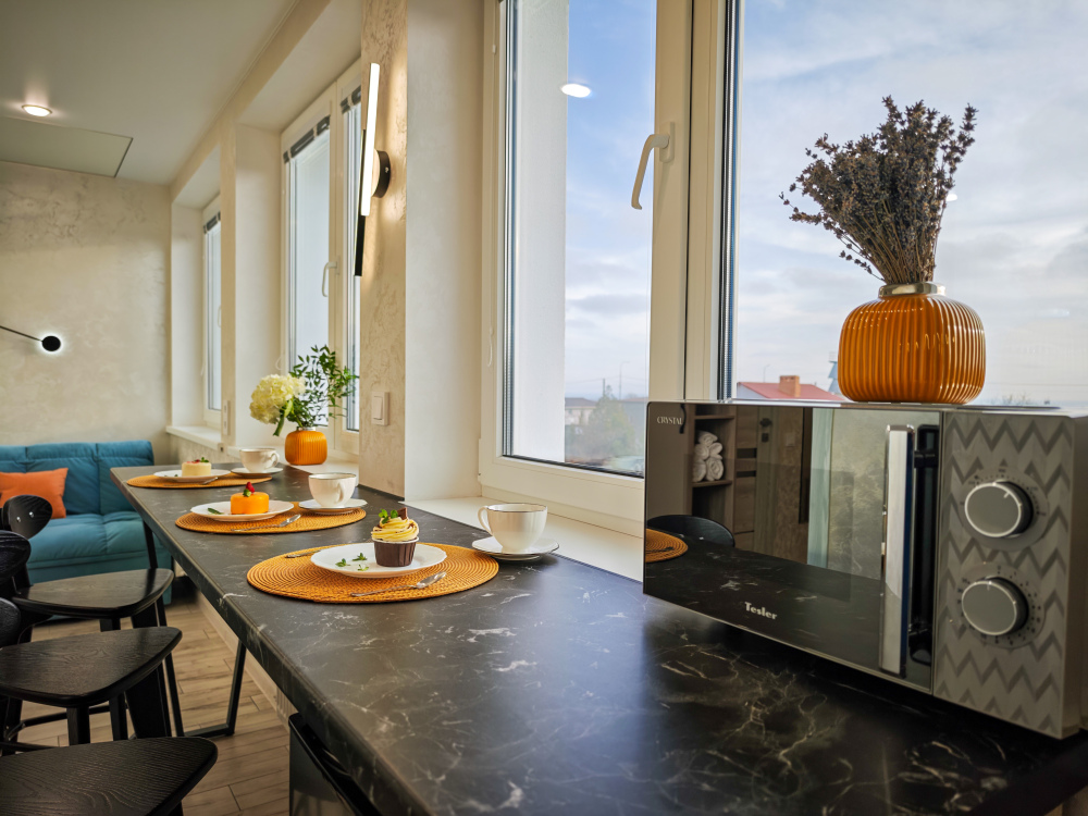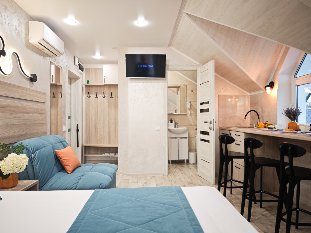 Современный интерьер и новая мебель. Удобные двухспальная кровать с ортопедическим матрасом, Белоснежное сатиновое постельное белье и хлопковые полотенца премиального качества, кухонная зона с необходимой техникой, микроволновая печь, санузел с душем, стиральная машина в холле, кондиционер, Smart TV, холодильник, фен, бесплатный Wi-Fi.