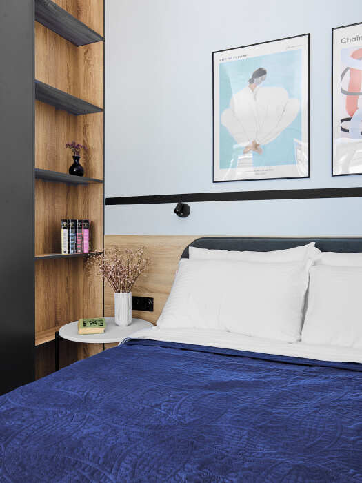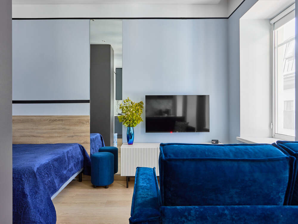 В квартире с комфортом разместятся три взрослых человека или два взрослых и два малыша - предоставляется двуспальная кровать с ортопедическим матрасом средней жёсткости, а также раскладной диван со спальным местом шириной 100 см.