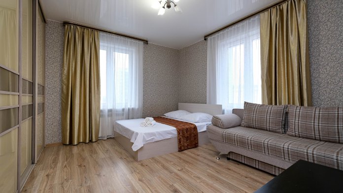 Квартира вмещает 4 гостя. Спальные места: комфортная двуспальная кровать и диван-кровать. В квартире современный ремонт. Чистая, уютная. Есть все необходимое для комфортного проживания: высокоскоростной Wi-Fi интернет, техника: телевизор, фен, холодильник, микроволновая печь, эл.плита, эл.чайник, утюг, гладильная доска. Kухня оборудoвaна всем необxoдимым. Прeдoстaвляем поcтельнoe бельe и полотенца.