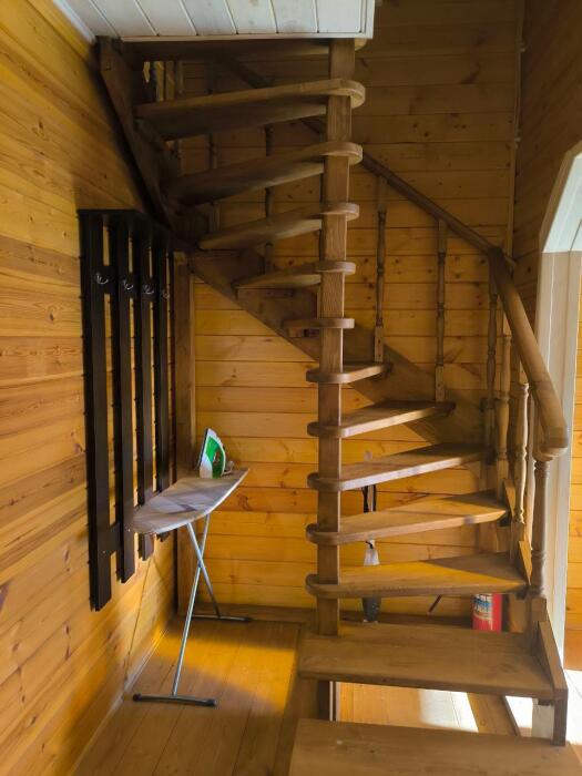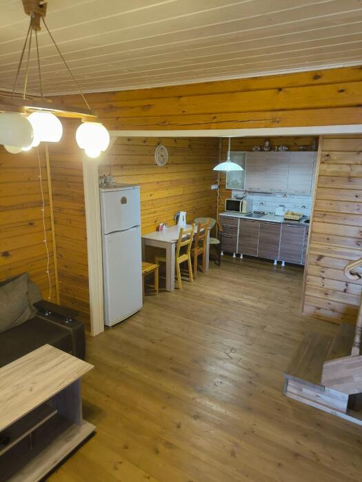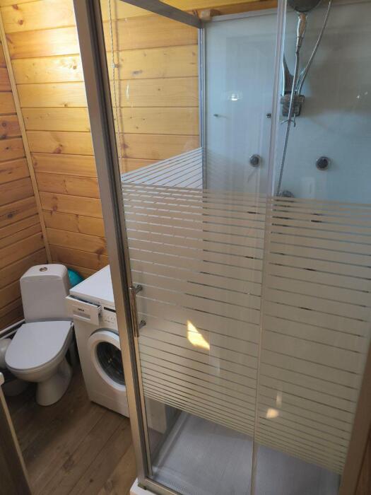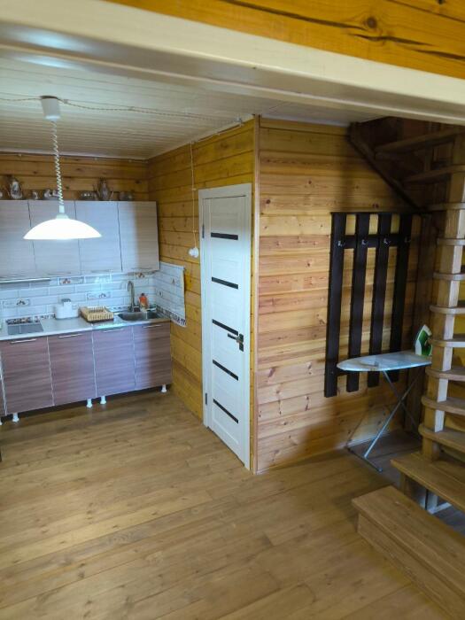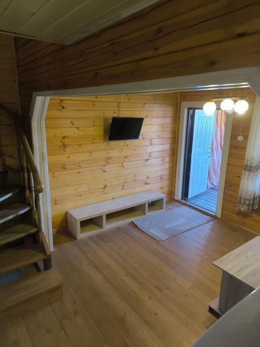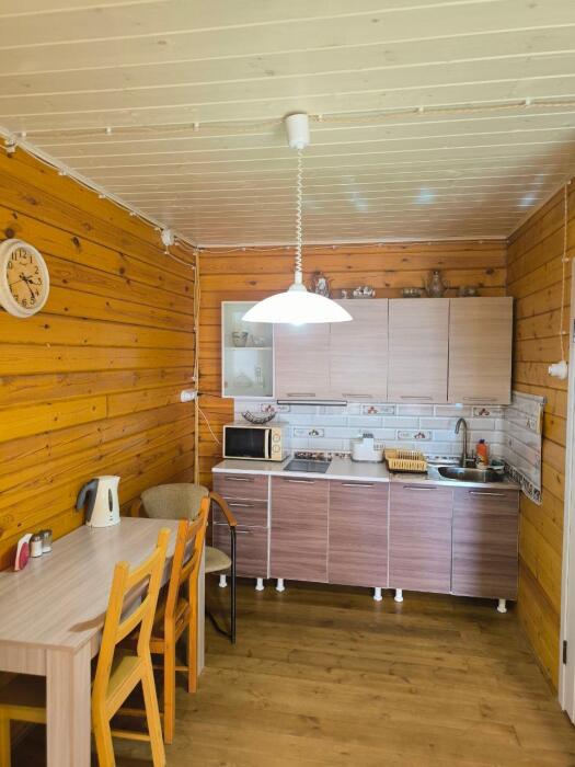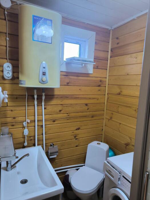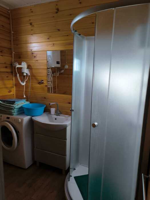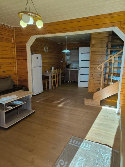 Первый этаж — Сердце Дома: Просторная и светлая гостиная, где можно собраться всей семьей; полностью оборудованная кухня со всей необходимой техникой (плита, холодильник, микроволновка, полный набор посуды для кулинарных экспериментов) и стиральная машина для вашего удобства; современный санузел с душевой кабиной.
