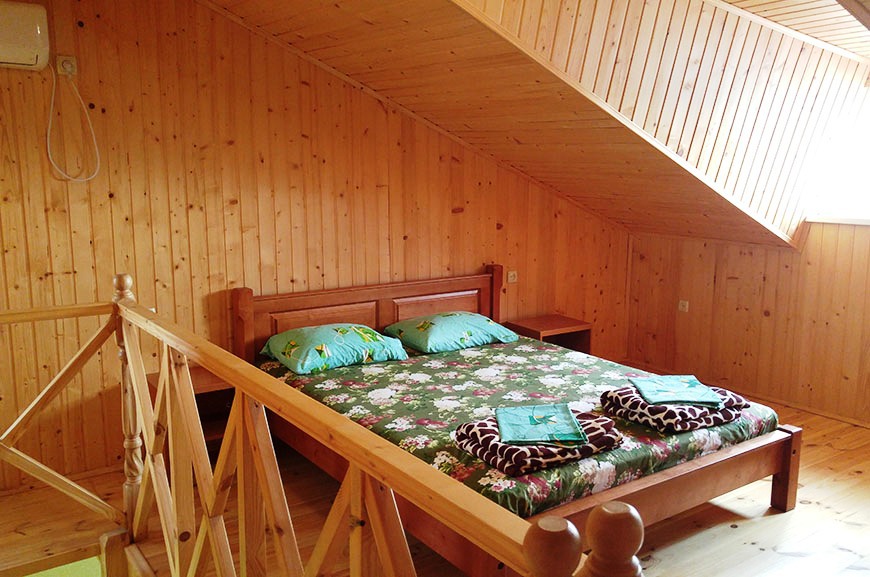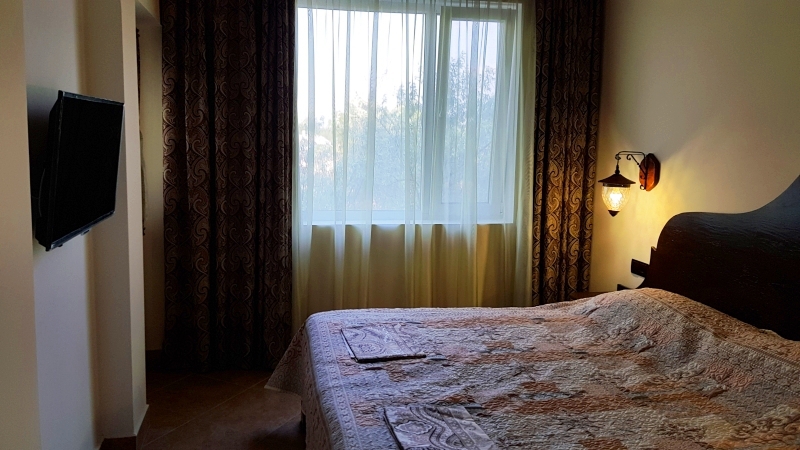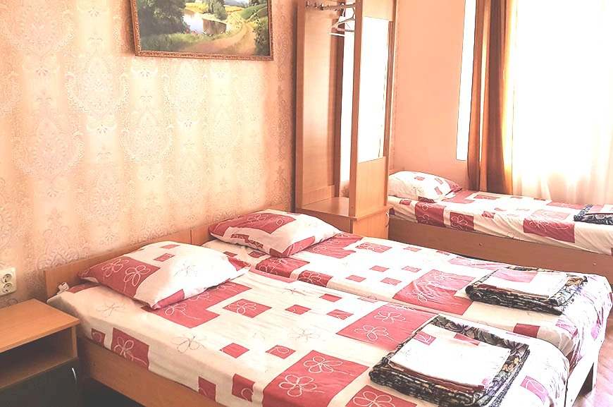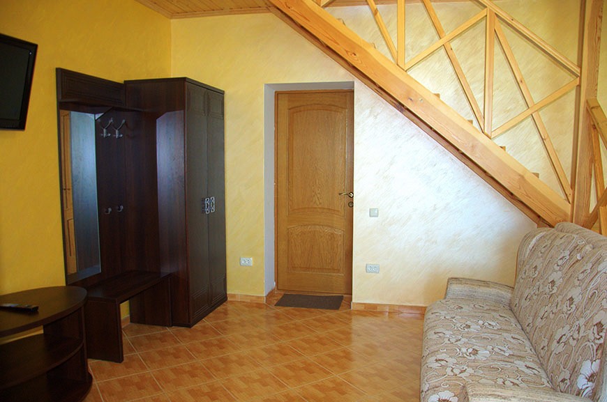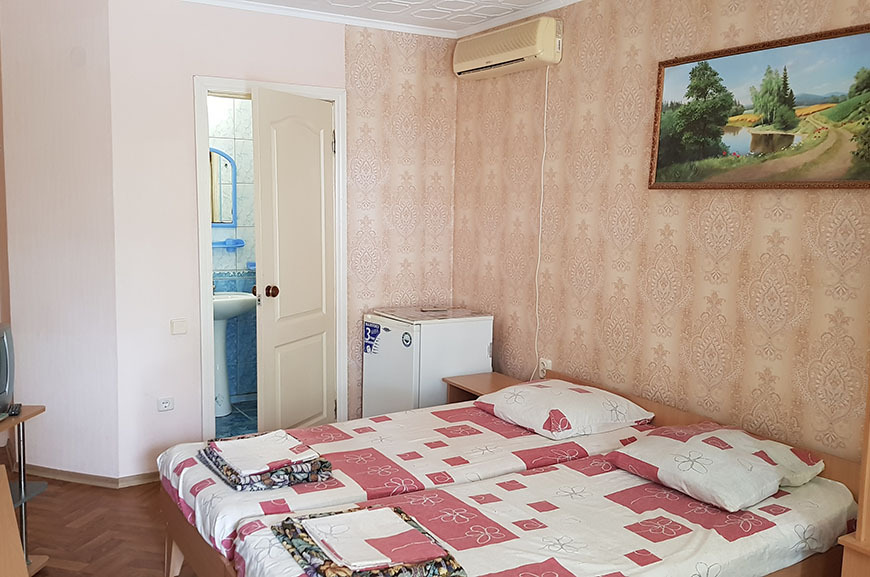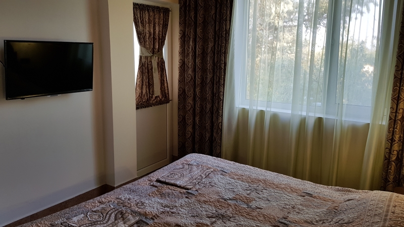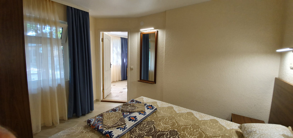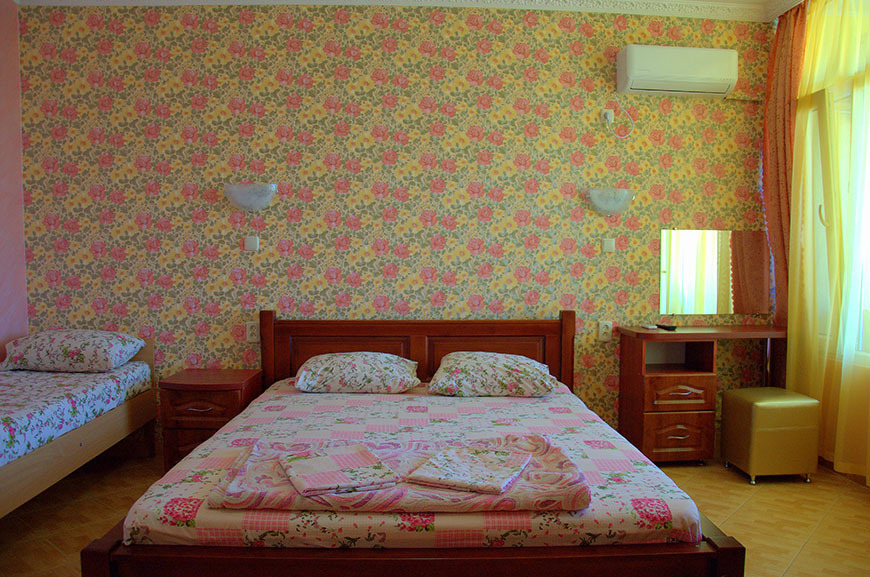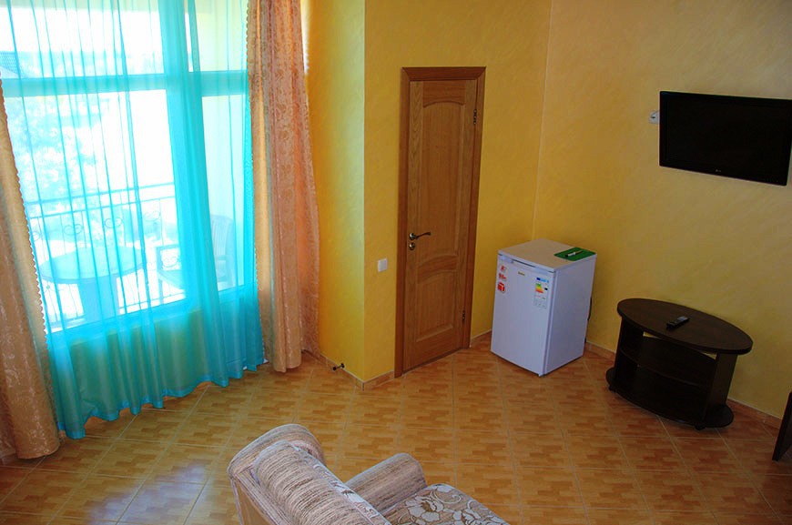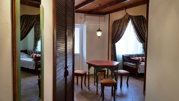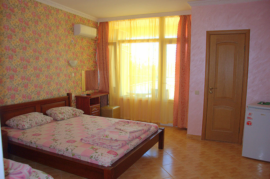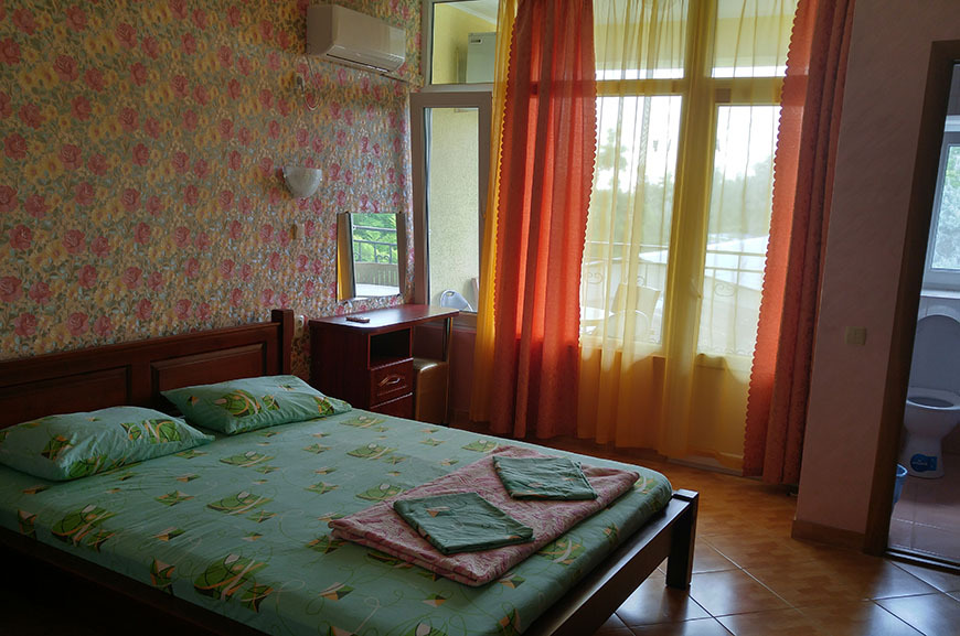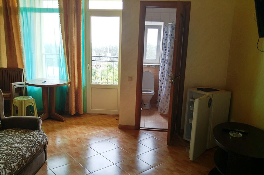 В номере: 2 односпальные кровати, шкаф-тумба с зеркалом, тумбочка, балкон со столом и креслами.