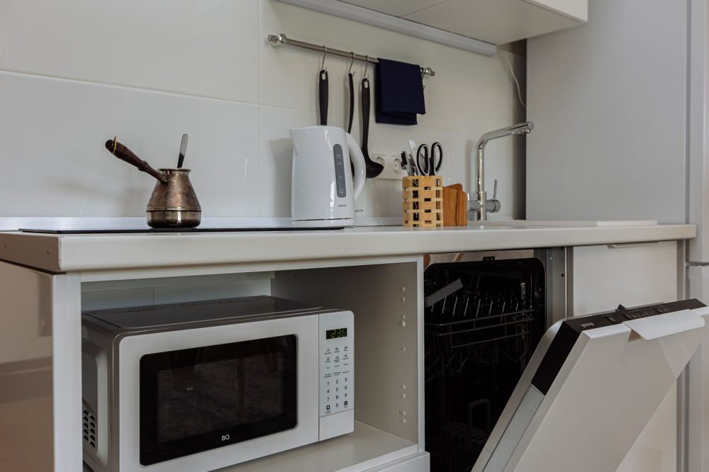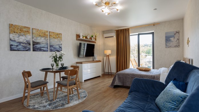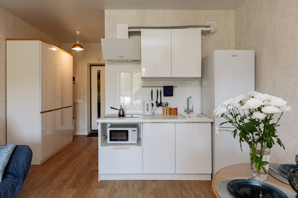 В квартире полноценная спальня и кухня-гостинная, у нас с комфортом можно разместиться 2 взрослым или семье с 2 детьми.