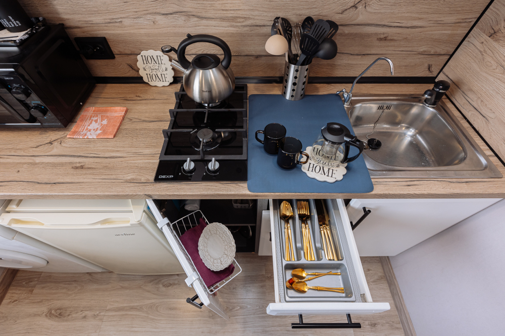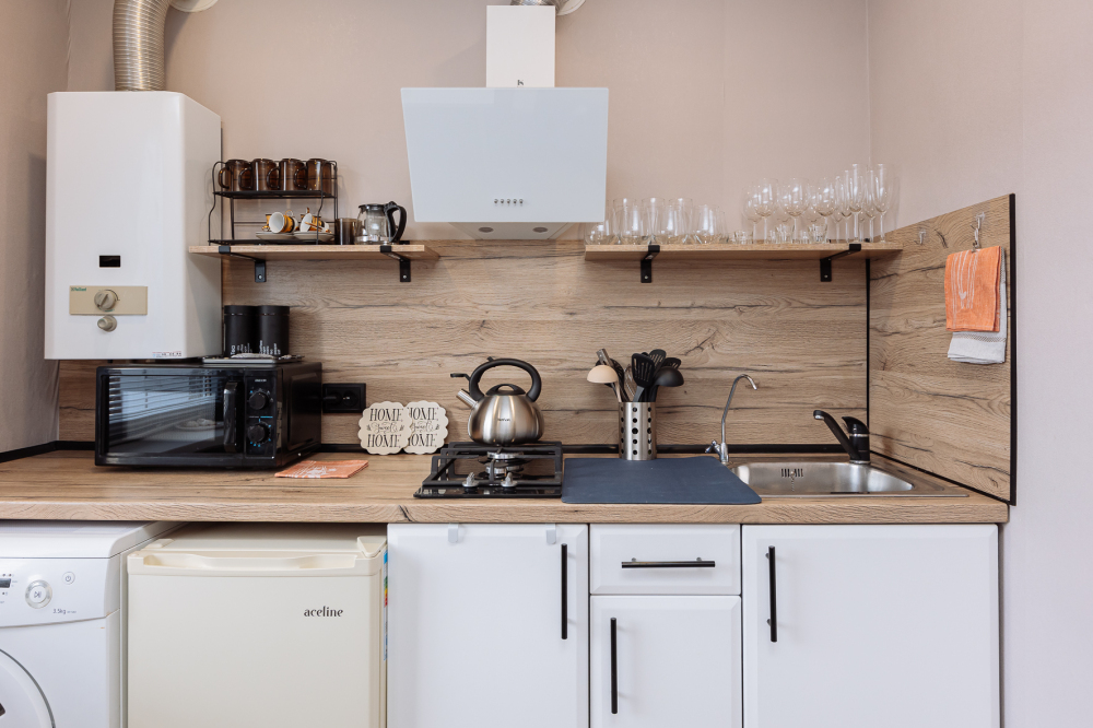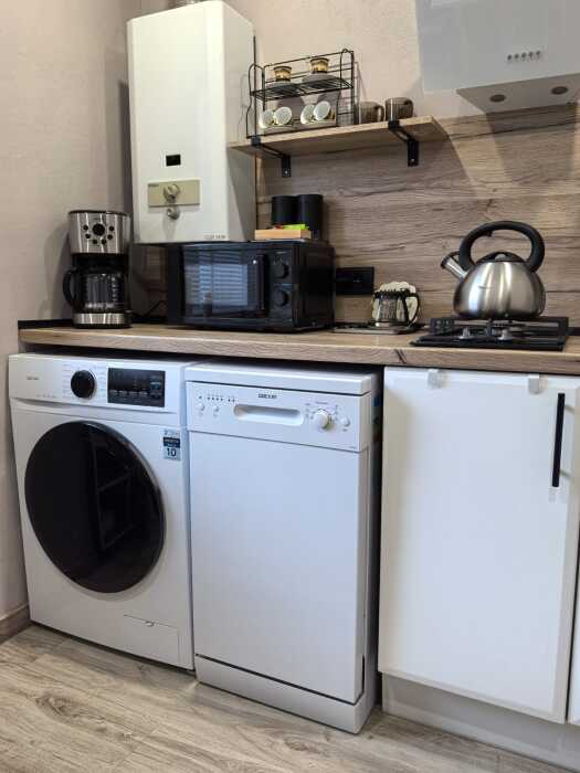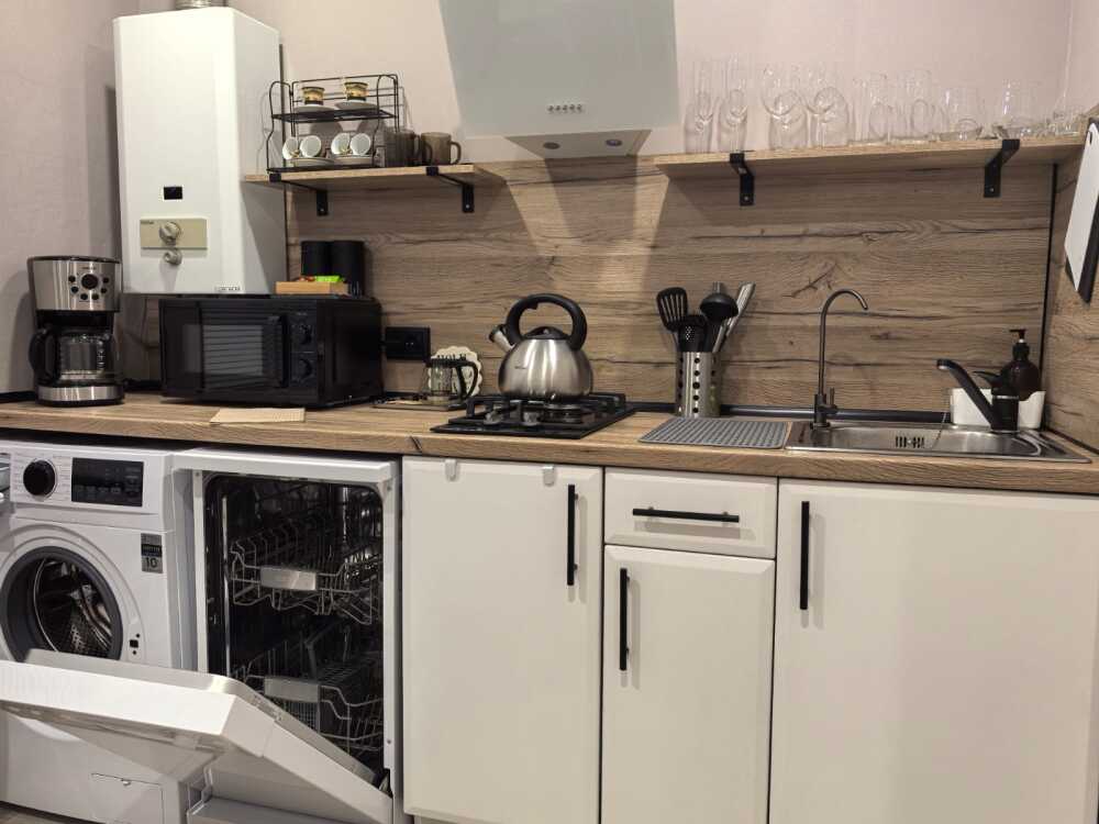 - плита, посудомоечная машина, микроволновка, чайник, кофемашина, холодильник