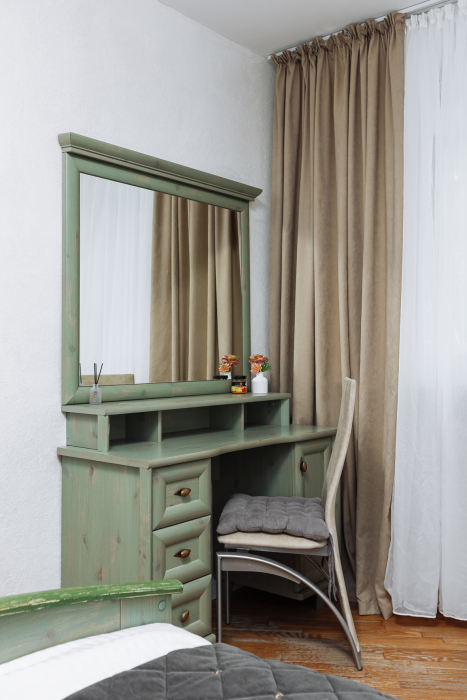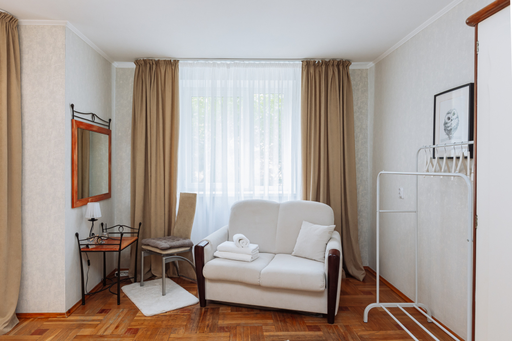 В комнатах Вы сможете отдохнуть на больших кроватях с комфортными матрасами. В них есть рабочий уголок с зеркалом, при необходимости Вы сможете поработать. В гостиной Вы сможете расположиться на большом и удобном диване за просмотром любимых фильмов. А также в комфортных креслах получиться почитать книгу. Есть дополнительное спальное место на 2 детей или 1 взрослого - раскладной мини-диван.