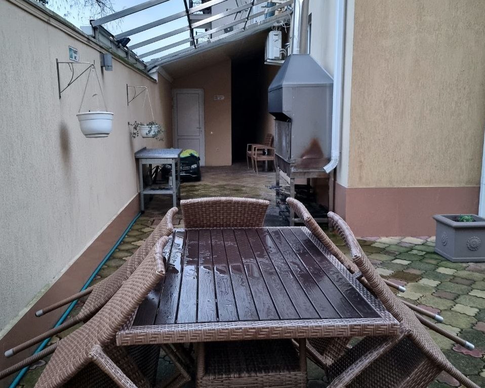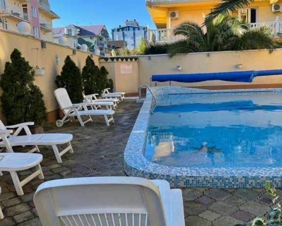 Придомовая территория огорожена забором, на территории есть подогреваемый бассейн с зонтиками и шезлонгами. Кроме этого есть зона отдыха и зона барбекю.