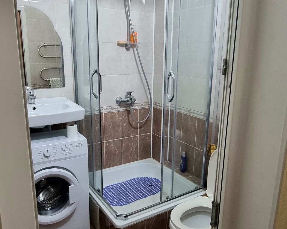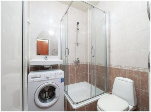 Санузел совмещенный, оснащен зеркалом, унитазом, душевой кабиной, стиральной машиной, феном.