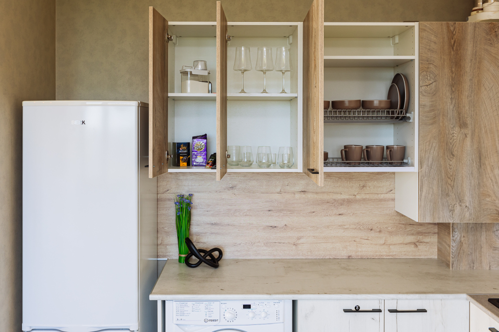 - набор посуды, сковородки, кастрюли и все необходимое для приготовления еды