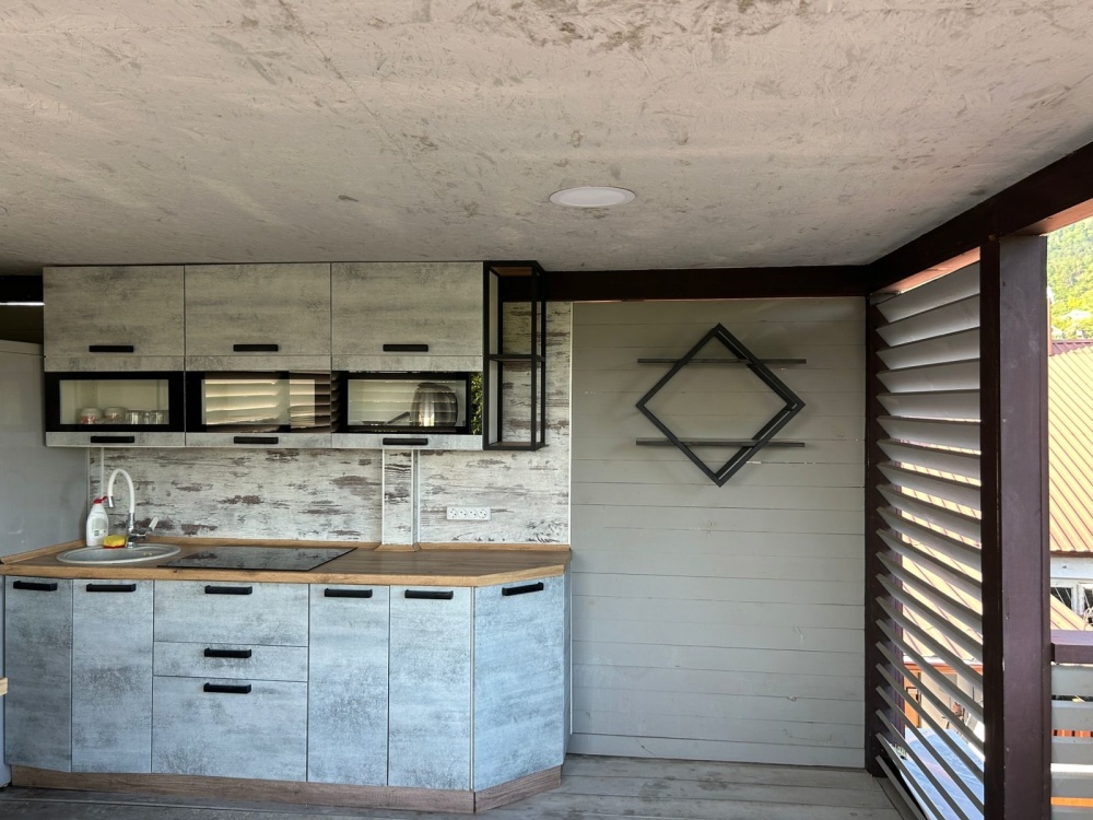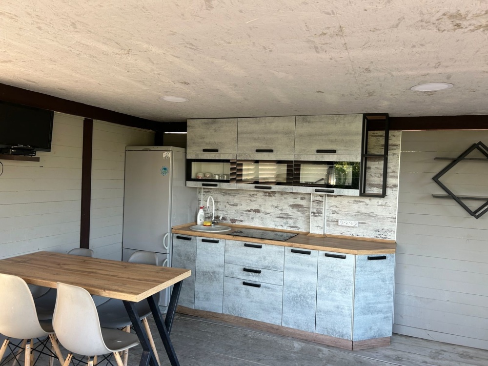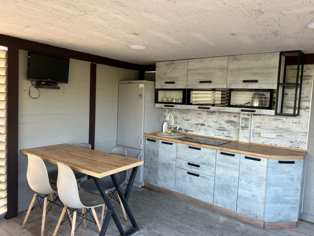 Кухня для самостоятельного приготовления со всей техникой и посудой.