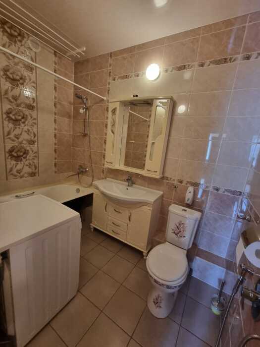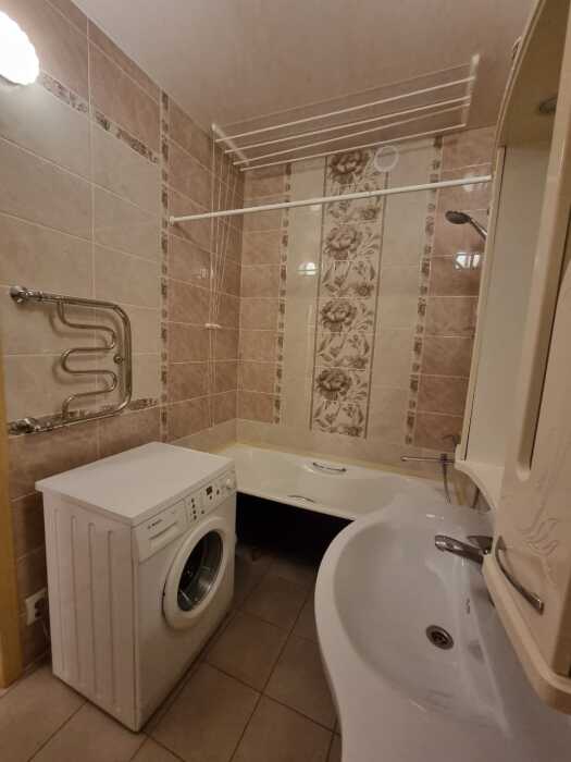 Санузел оборудован ванной, стиральной машиной, полотенцесушителем, раковиной, зеркалом, унитазом.